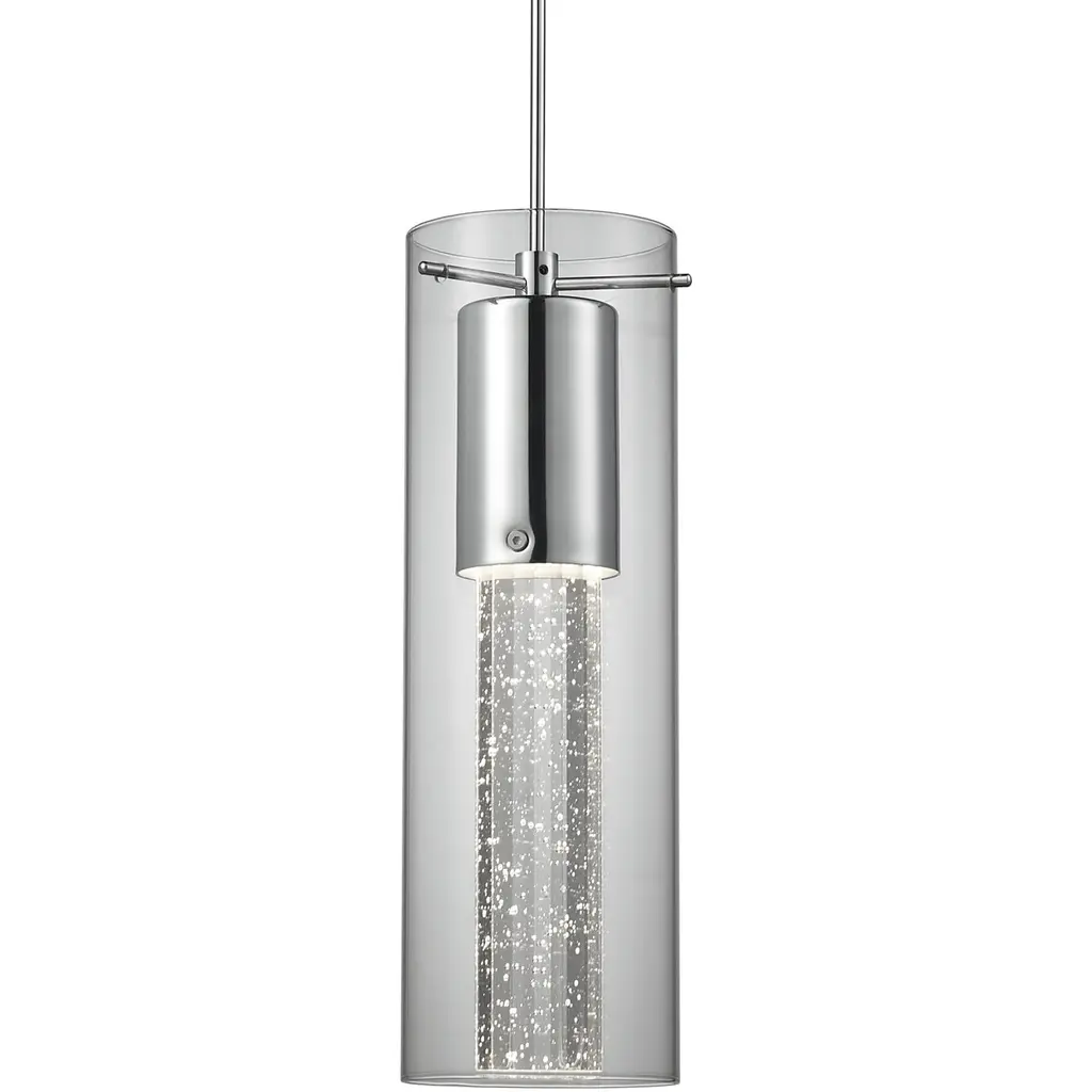 The Wanda 12 LED Pendant is composed of a narrow clear glass cylinder, with an interesting bubble pattern blown randomly throughout the glass. The pleasing play of light through the bubble accents make for a striking affect, along with the splash of concealed LED downlight makes the Wanda ideal for task oriented applications. The 12V cord pendant fixture is equipped with a 10' braided coaxial cord with Teflon jacket and a low profile flat monopoint canopy. These stylish and functional luminaries are offered in a beautiful Satin Nickel finish.