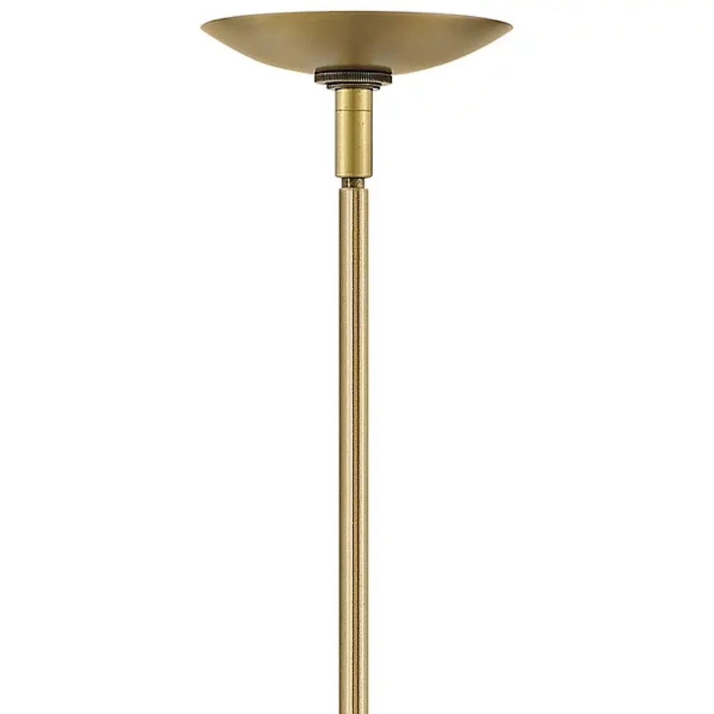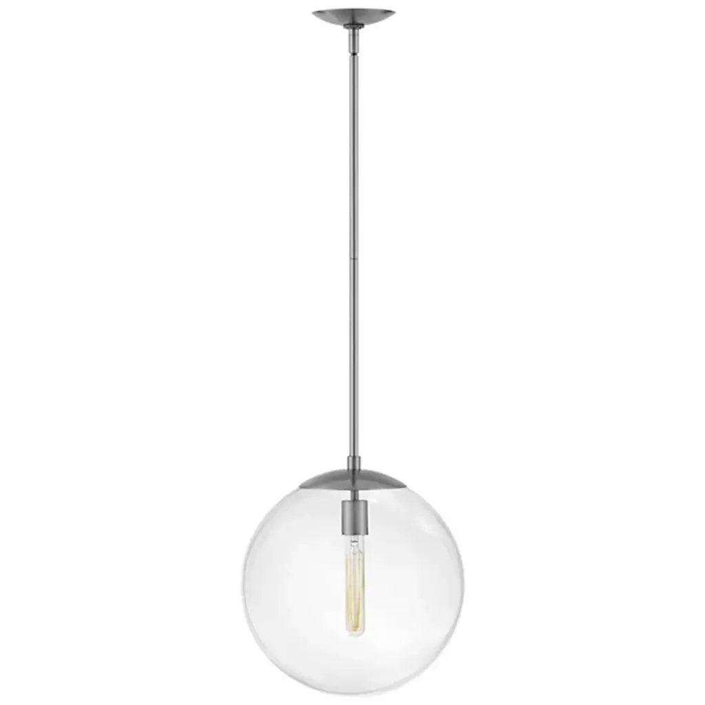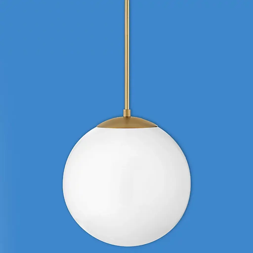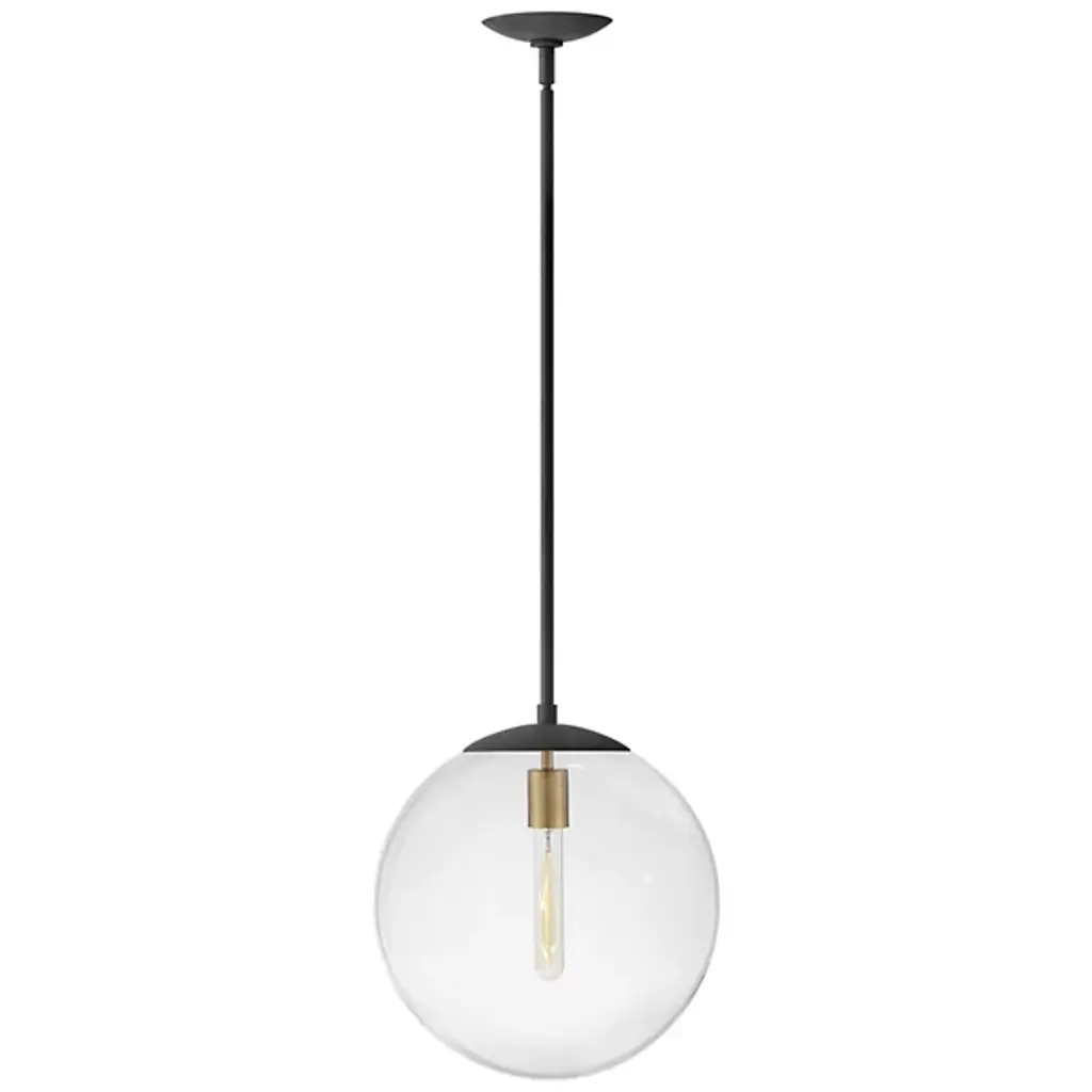 Simple lines for a striking design. The Warby Pendant from Hinkley is a mid-century modern design achieving the fine balance between form and function. Descending from a low-profile canopy with a fine stem, the piece makes it easy to arrange as a series over a table or slot one by itself in a tight space. The steel structure accentuates the brilliant globe at the base with a bold finish. Calling back to mid-century classics, the glass globe catches the eye at any time of day. A golden glaze wraps the glass as light radiates through it. The pendant creates a comfortable ambiance and a relaxed down glow.