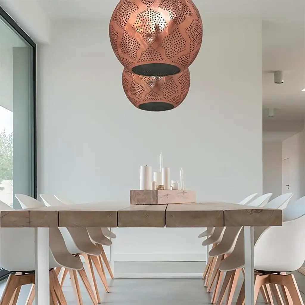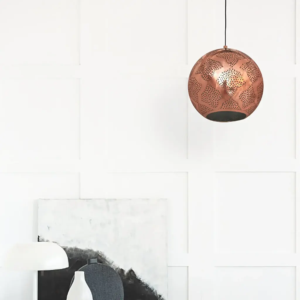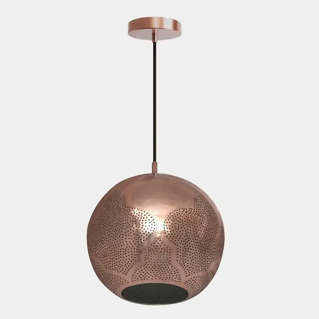 Looking for a statement piece that will add a touch of industrial style to your home or commercial space? Consider the Warda Copper Industrial Style Lighting! Expertly crafted by master metalworkers in Marrakech, this modern industrial pendant light combines contemporary shapes with mid-century design influences to create a truly unique and eye-catching look., The semi-precious hand-etched copper shade of this industrial metal pendant creates a warm and inviting ambiance in any space, making it perfect for industrial living room lighting or as an industrial pendant chandelier in your entryway. The versatile spherical shape of the copper ceiling light fixture makes it an ideal piece for any room, from the bedroom to the dining room., In addition to its striking design, the copper industrial pendant lighting is also UL listed, ensuring that it meets the highest safety standards. Each industrial hanging light fixture ships with a matching ceiling cup and adjustable cord for easy installation, and LED bulbs are recommended for optimal energy efficiency. Available in a range of sizes and modern metal finishes, the Warda industrial ceiling light is the perfect addition to any modern interior. Whether you're a professional interior designer or a home decorator, this unique and luxurious piece will help you create a space that truly stands out. Find the perfect fixture to fit your space today!
