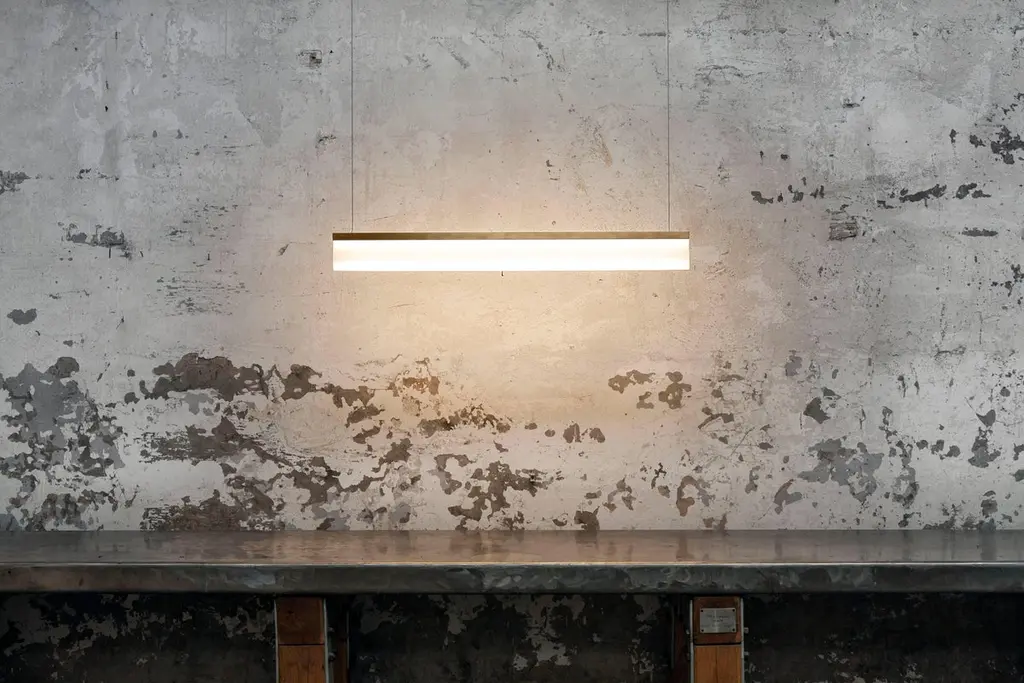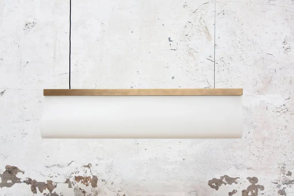 Calypso, light pendant by Morghen StudioPendant lampYear: 2016Materials: brushed brass, silicone, LED lightDimensions: 100 x 10 x 5 cmLight source: strip LED smd 2835 – 22.5 w - 3.000 k - 1.980 lmDriver: external (AC 220v/ DC 24v)Dimmable: yes upon request.The Calypso family stems from the investigation of the transmitting properties of an everyday usage material. Silicone is well known for its multiple qualities, whilst its relationship with light is still to be researched.By using a pmma profle, the hidden led light is focused and directed towards the silicone di?user, which in return lights up with soft shades of warm light.The result is a unique entity that glows gently, apparently generating light itselfMorghen is a multidisciplinary studio that works on the boundaries between design,art and craftsmanship. They rely on techniques passed on by the artisan heritage mixed with experimentation and contemporary materials.Every single piece is conceived, developed and hand crafted in a carefully renovated old carpenter’s shop located in the Milanese Bovisa district.Every single piece evolves from and assimilates previous theoretical and practical research.Every single piece is unique.Their work encompasses objects, furniture, lighting and spaces.