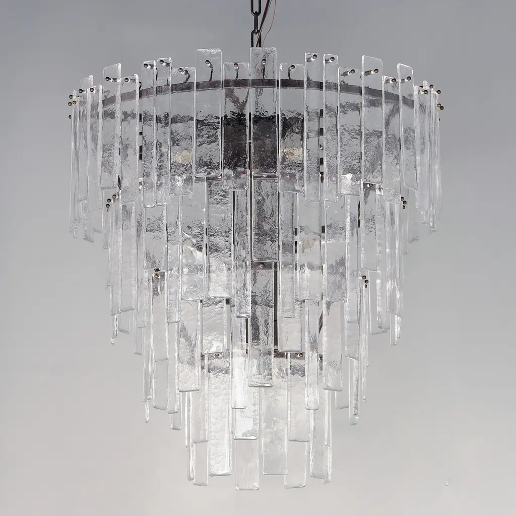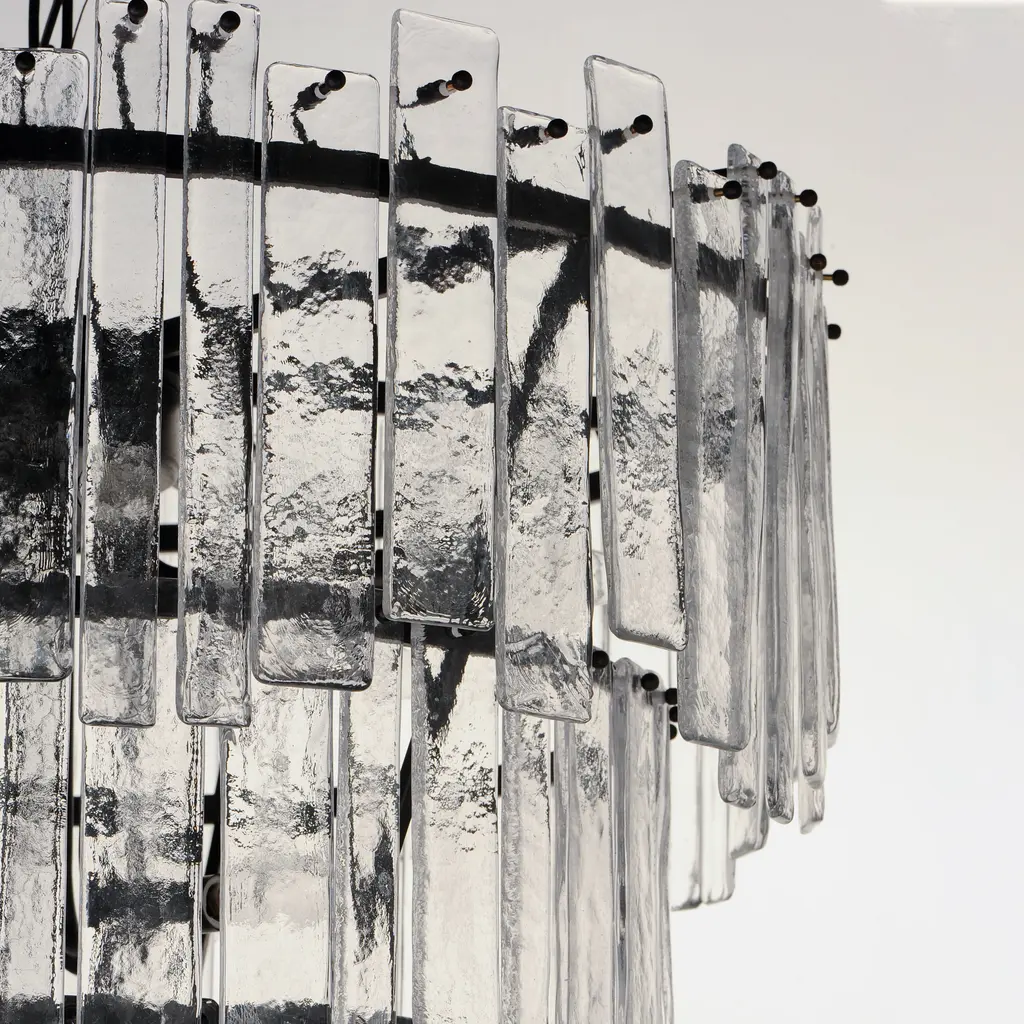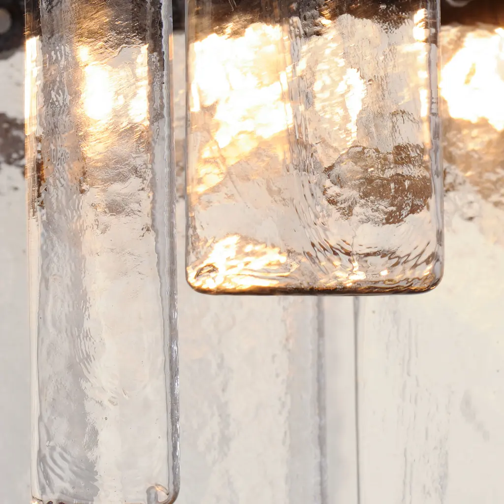 Sophisticated glass forms of uniquely organic character drapes rings of Darkened Bronze metal. The Warren series features handcrafted molten glass draped on rings in a darkened bronze finish. This handsome approach to tiered glasswork pendants delivers a warmer and moodier aesthetic and enhances a classic contemporary look.