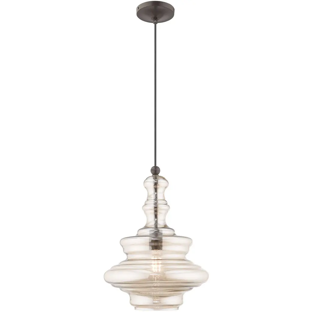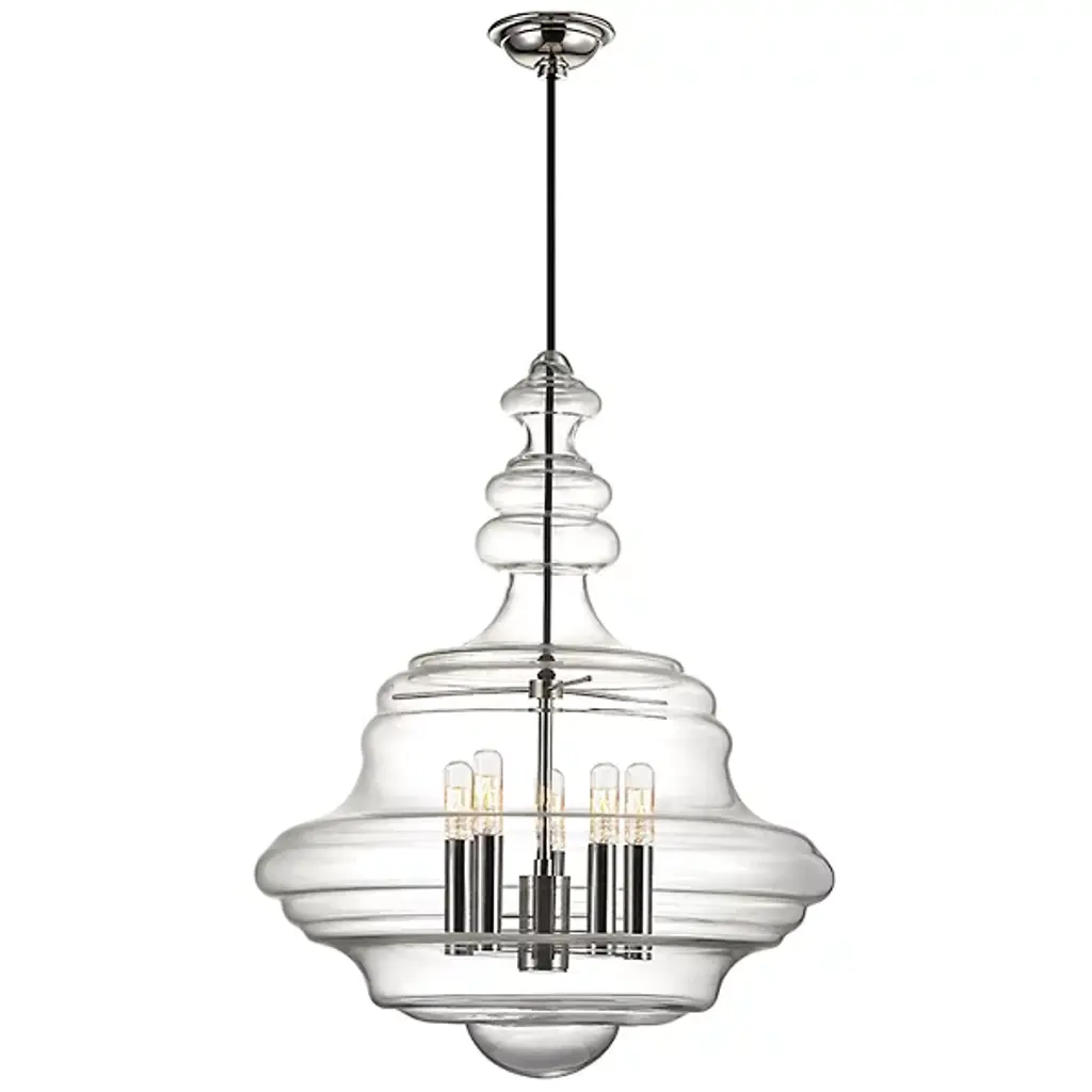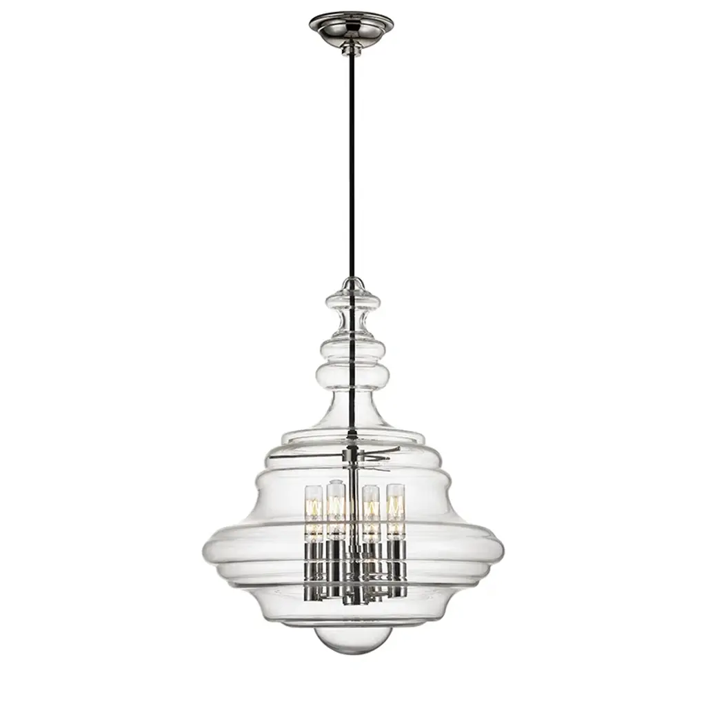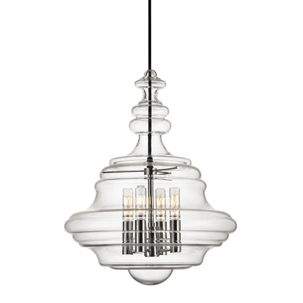 To create Washington’s elaborate shape, a skilled artisan works molten glass into a paste mold as an assistant assiduously turns it. With careful timing, the team produces a seamless piece of beautifully figured glasswork. Smooth cylinders of metal sporting exposed-filament bulbs complement the round contours and curves of this breathtaking outer layer of glass. Features