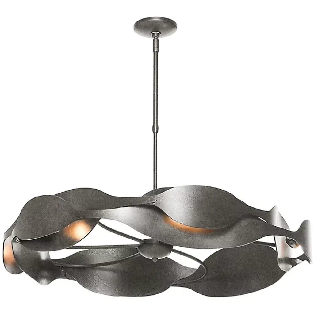 An elegant example of fine metalwork. The Waves Pendant by Hubbardton Forge evokes the flowing movement of water through its slender bands of undulating metal. The drum-shaped fixture forms a steady weave while its textural surface lends a raw and industrial quality. Hidden lamping is placed between the bands by long, curving arms that sprout from its central point and bring warmth to the piece as it emits a soft glow throughout.