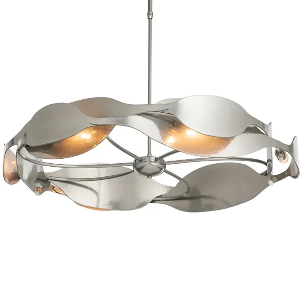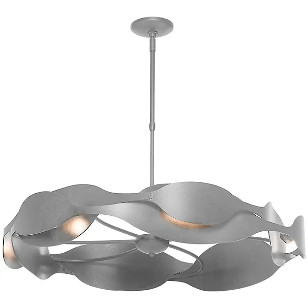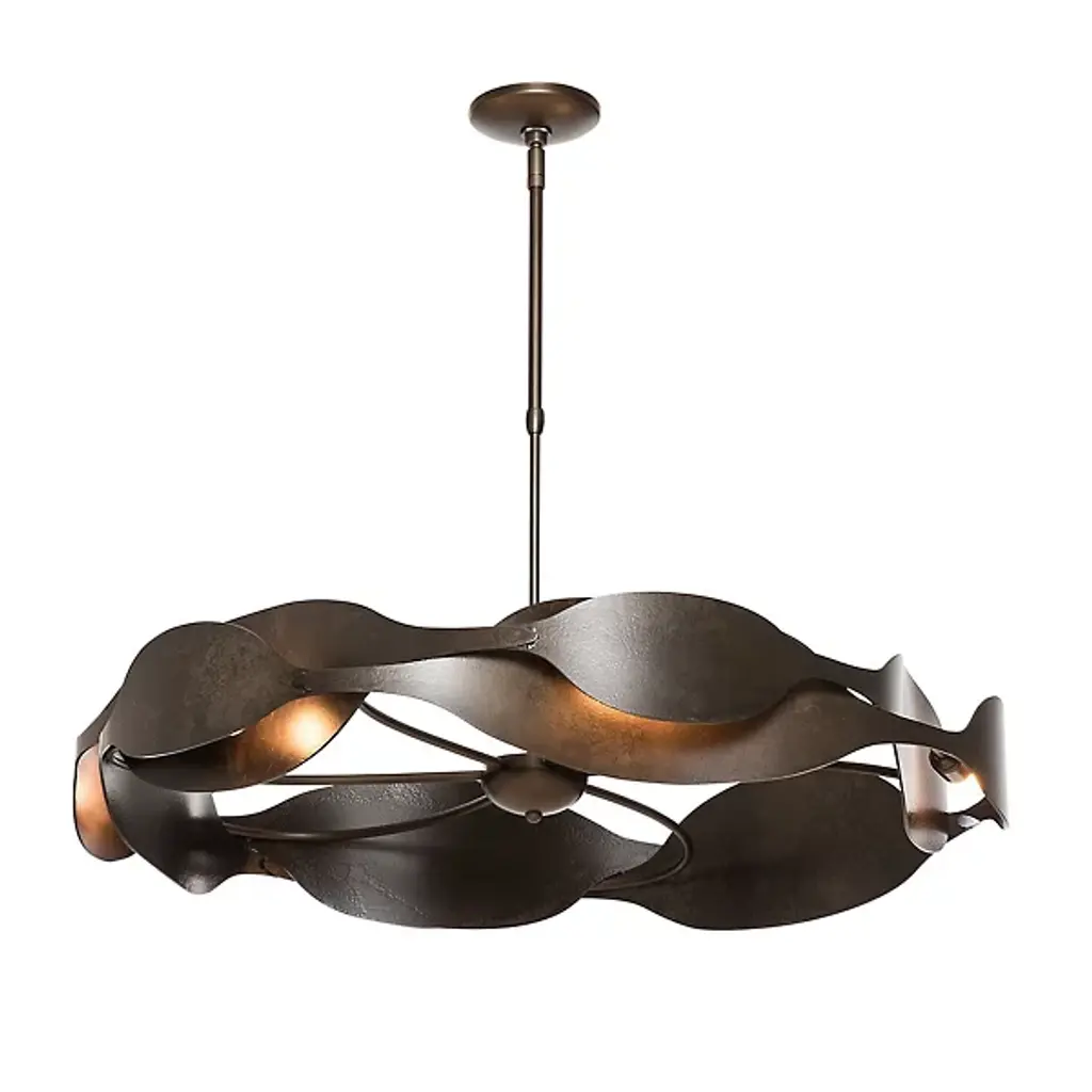 An elegant example of fine metalwork. The Waves Pendant by Hubbardton Forge evokes the flowing movement of water through its slender bands of undulating metal. The drum-shaped fixture forms a steady weave while its textural surface lends a raw and industrial quality. Hidden lamping is placed between the bands by long, curving arms that sprout from its central point and bring warmth to the piece as it emits a soft glow throughout.