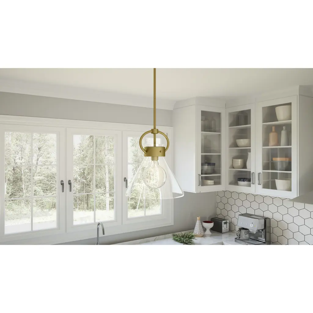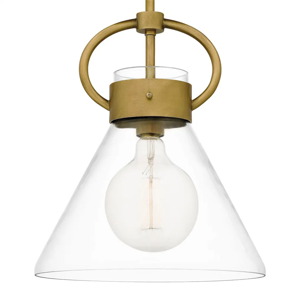 As a pendant, Webster casts a smart and tidy glow thanks to its clear glass shade. This industrial-inspired piece offers a subtle radiance and patina thanks to its weathered brass finish. Webster is also available as a semi-flush mount or larger island light.