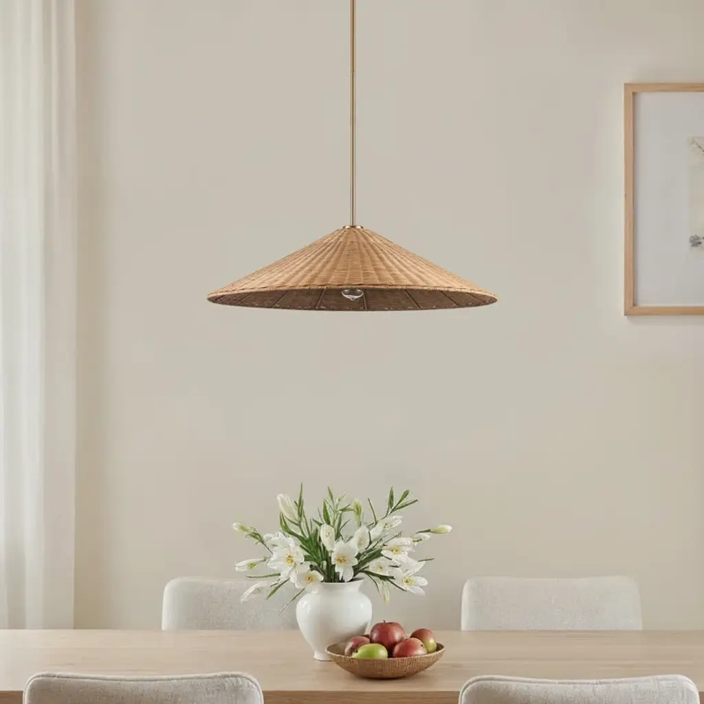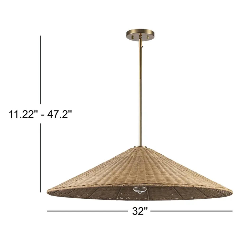 Elevate your space with the Sandy Cove 1-Light Rattan Dome 32" Pendant, a perfect fusion of coastal allure and contemporary sophistication. Its expansive 32-inch rattan dome design offers a striking visual impact, showcasing natural elegance that enhances any room. Ideal for modern interiors, this pendant accommodates one Medium base E26 bulb (not included), providing a seamless blend of style and functionality to illuminate your home with a warm, inviting glow.