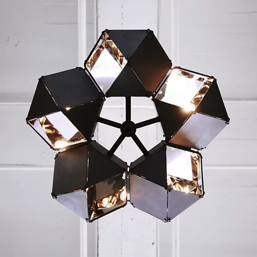 A sequence of interconnected shapes. The Welles 5 Spoke Pendant from Gabriel Scott displays a robust and modular design that works well in living rooms, corridors, and hallways. The design features a series of geometric shapes interlocked together to create a distinctive lighting system capable of casting various silhouettes. The large cluster of shapes branch out on long stems, and the entire thing hangs from a simple canopy by a slender downrod.
