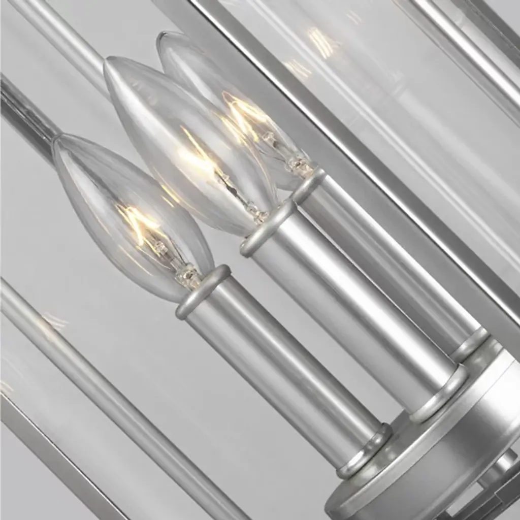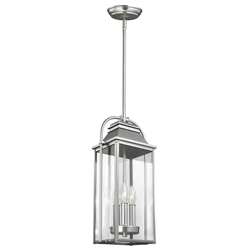 The Wellsworth 3-Light Outdoor Pendant by Visual Comfort Studio, formerly known as Sean Lavin, brings an Old World charm to contemporary spaces. This piece is topped with a sleek lantern-style handle and a stylish segmented roof with crisp, overlapping lines and angles. Its tall frame is fitted with clear seeded glass panels that diffuse the warm light from a candelabra cluster within. Made from durable cast aluminum, the fixture resists corrosion, providing long-lasting usage whether installed over a balcony, patio, or porch.