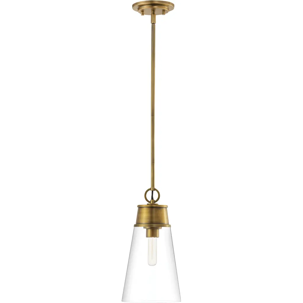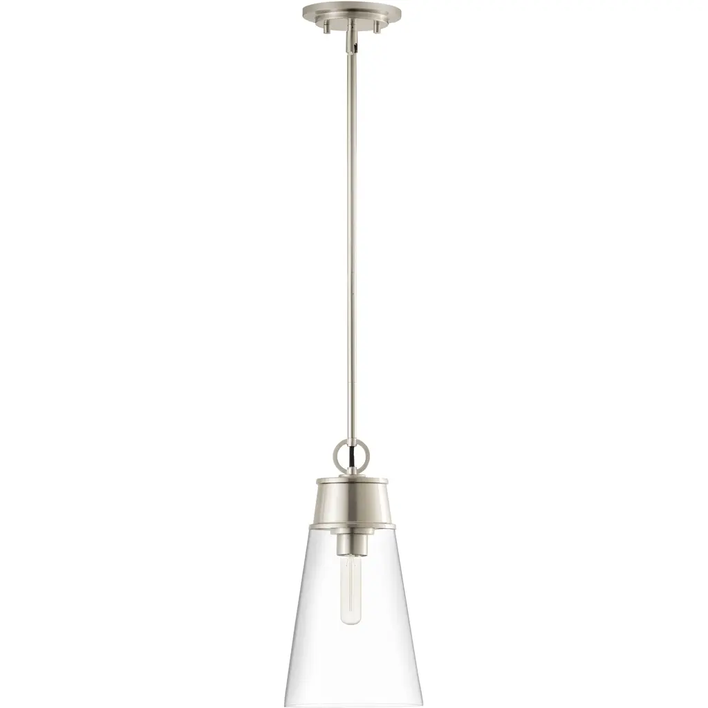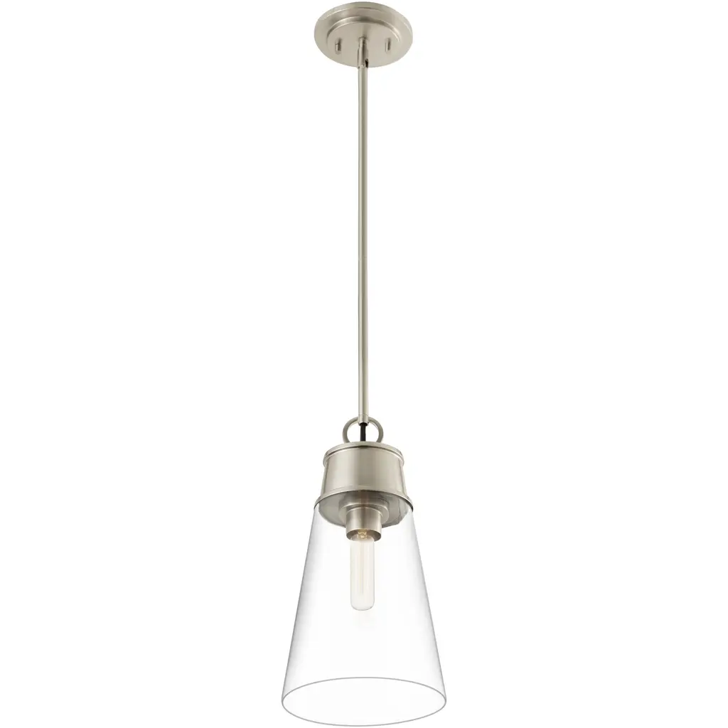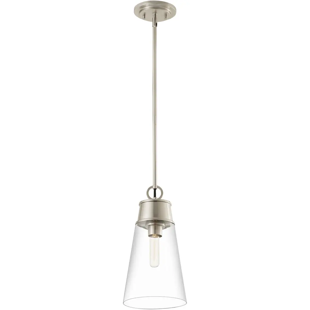 A slender silhouette forms enticingly clean lines that enhance the sophisticated look of the Wentworth single-light mini pendant. Bring targeted lighting to a nook or reading space with this elegant fixture fashioned of brushed nickel finish metal and a conical clear glass shade. An ideal choice for custom spaces, this pendant adds a signature design stamp to define personal taste.