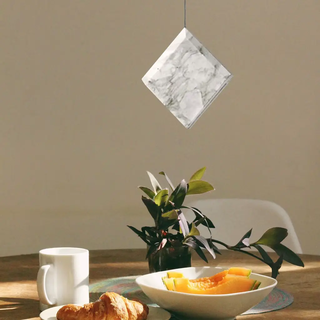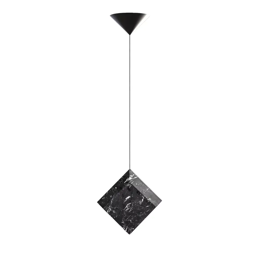 This stylish lamp is composed of a thin square in marble, a single emission of LED light, and a suspension with steel wires. It is a lamp with an essential geometry that enhances the quality of handcrafted marble and the high technology of the LED lighting system. An object that does not invade the environment but furnishes it with class, thanks also to an enveloping and discreet light that guarantees a high Visual Comfort. The voltage is 110/220v with 5W LED and 2700K light temperature.