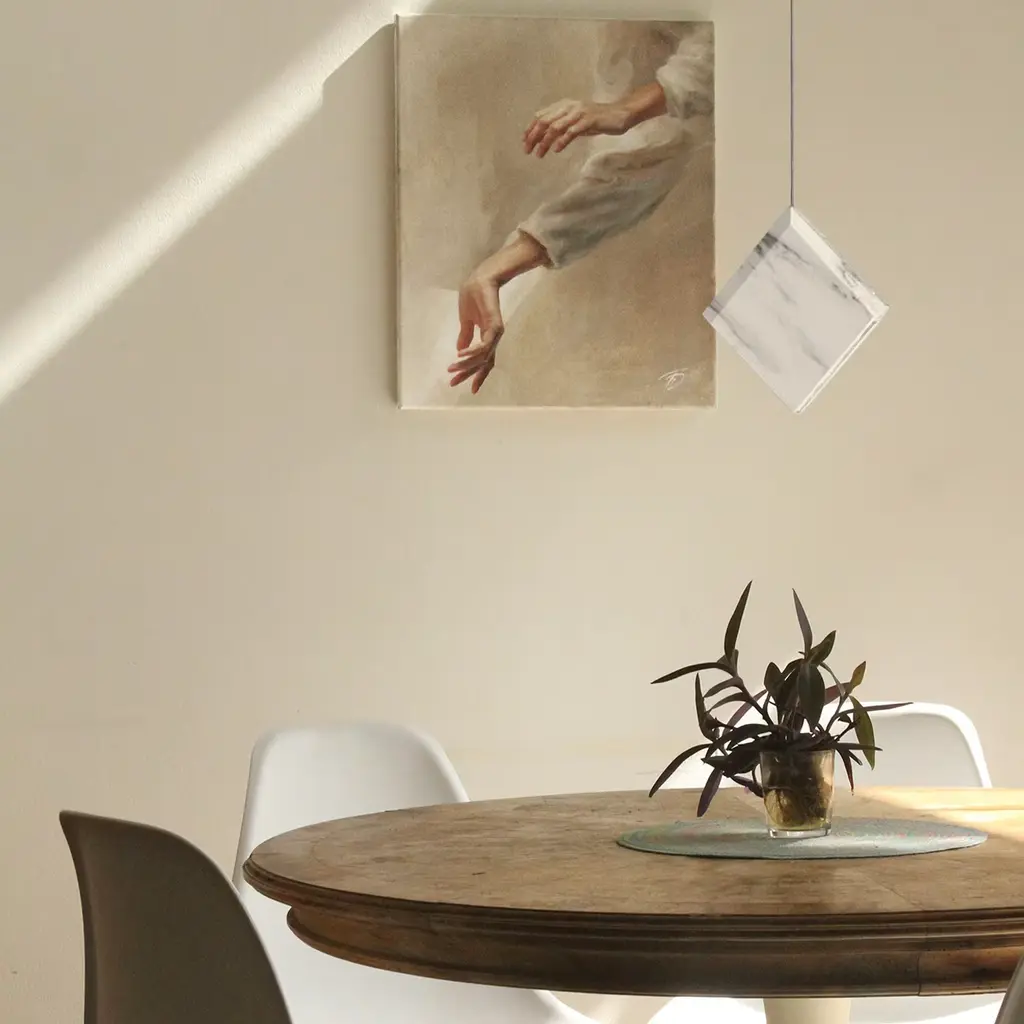 This stylish lamp is composed of a thin square in marble, a single emission of LED light, and a suspension with steel wires. It is a lamp with an essential geometry that enhances the quality of handcrafted marble and the high technology of the LED lighting system. An object that does not invade the environment but furnishes it with class, thanks also to an enveloping and discreet light that guarantees a high Visual Comfort. The voltage is 110/220v with 5W LED and 2700K light temperature.
