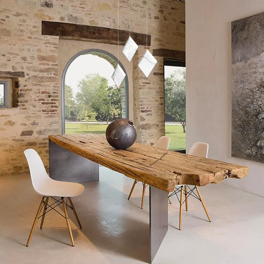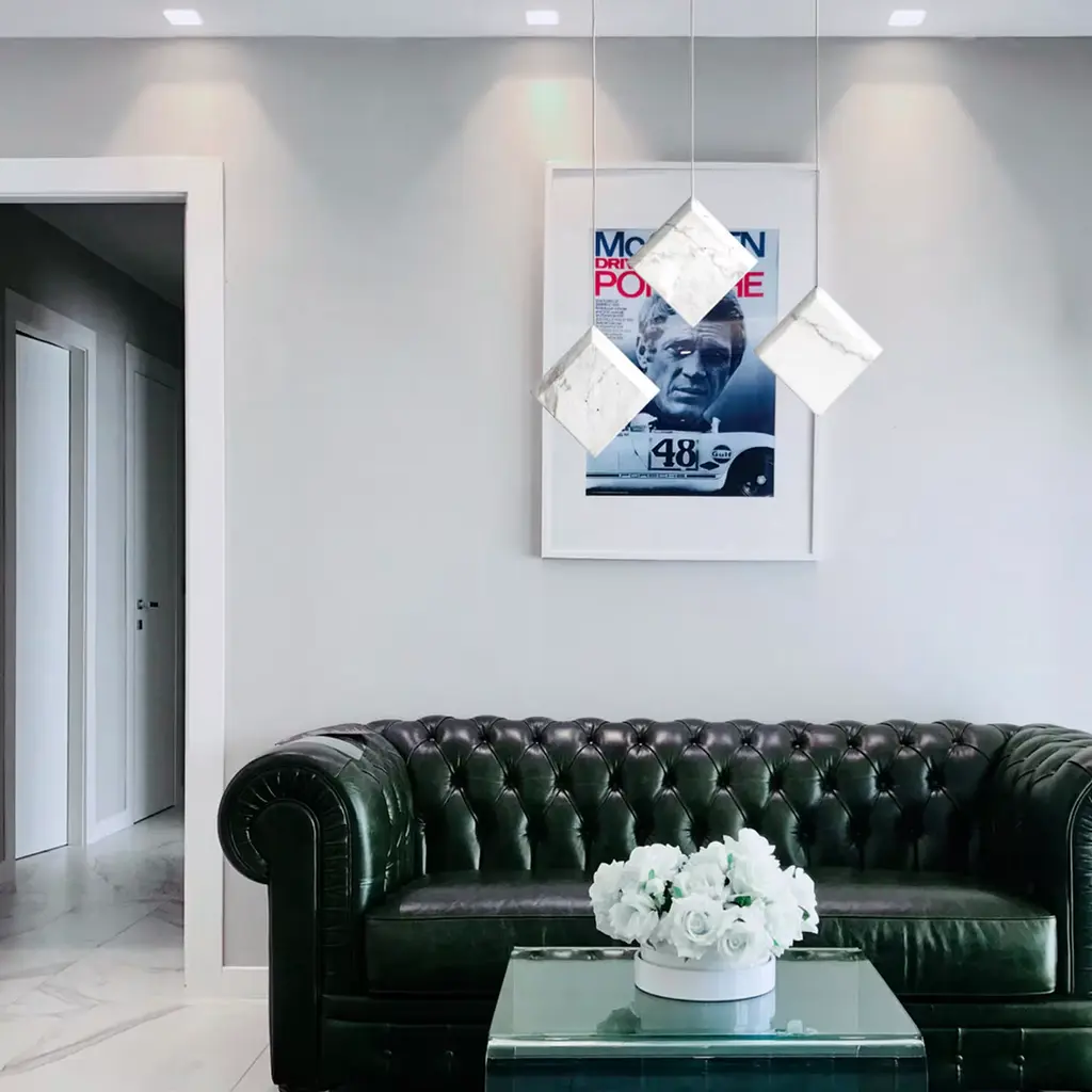 An exercise in minimalist sophistication, this pendant lamp imbues any contemporary interior with dynamic flair with its linear steel structure with a satin silver finish dominated by pure geometric forms and supporting three thin squares of hand-cut Carrara marble hanging at different heights. The innovative, single emission LED light of the 13 W bulbs has a temperature of 2700K. The lamp has a 110/220 voltage.