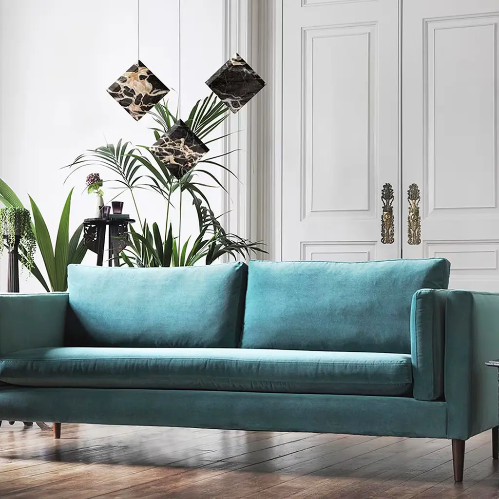 Exquisite craftsmanship and a minimalist aesthetic combine to create a superb pendant lamp of unique allure. The steel structure with a matte black finish stunningly complements the three thin squares of handmade Portoro marble that hang off steel wires of various heights. The result is of mesmerizing allure. The single emission LED light comes from 13 W bulbs with a 2700K temperature. The voltage is 110/220.