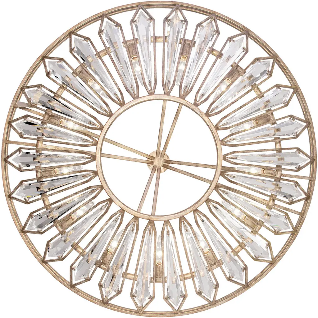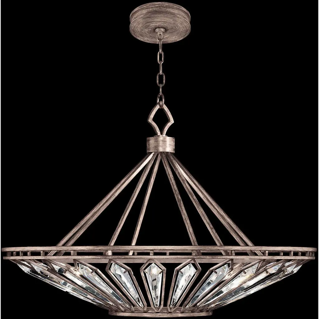 Pendant in a warmly washed pale antique gold thoughtfully designed to be both boldly dramatic and quietly subtle. Double-faced beveled crystals exquisitely float openly in individual metal frames. Also, available in a softly weathered English brown iron p
