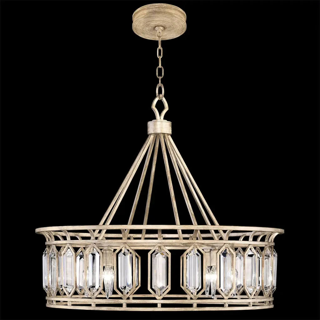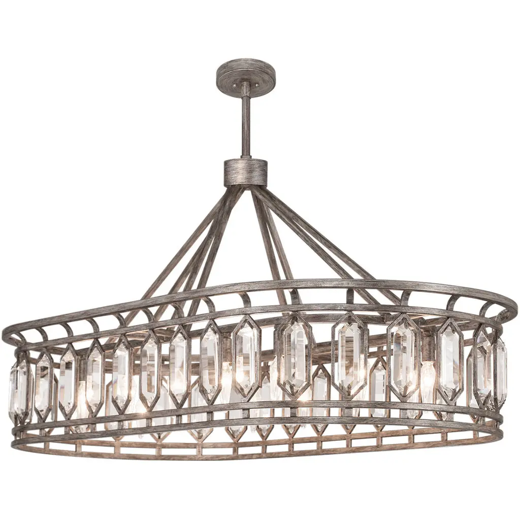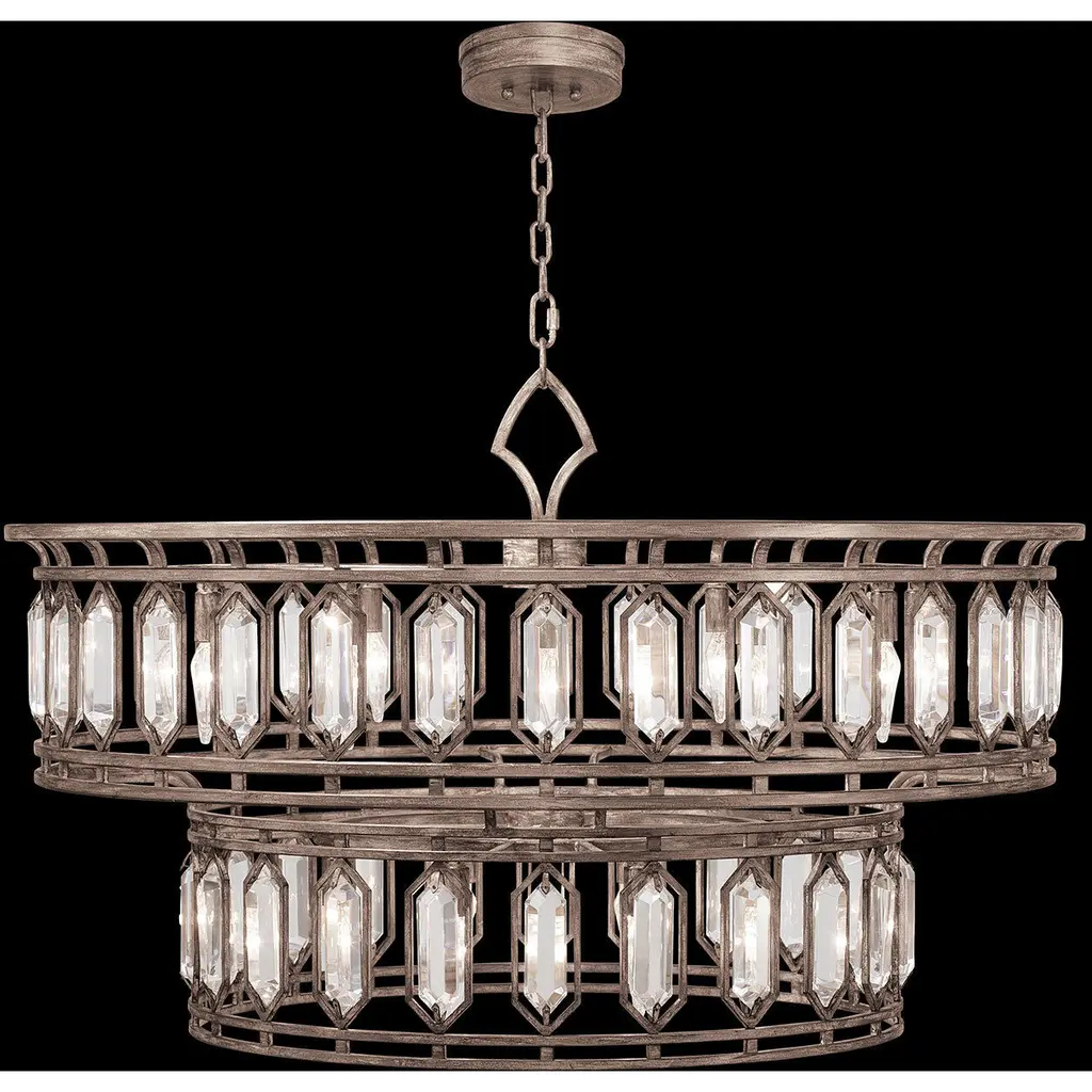 Oval pendant in a softly weathered English brown iron patina with vestiges of silver thoughtfully designed to be both boldly dramatic and quietly subtle. Double-faced beveled crystals exquisitely float openly in individual metal frames. Also, available in