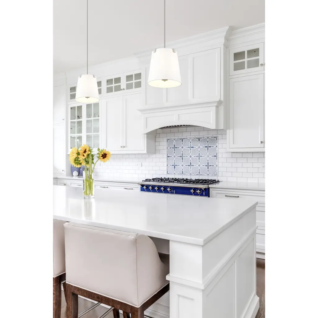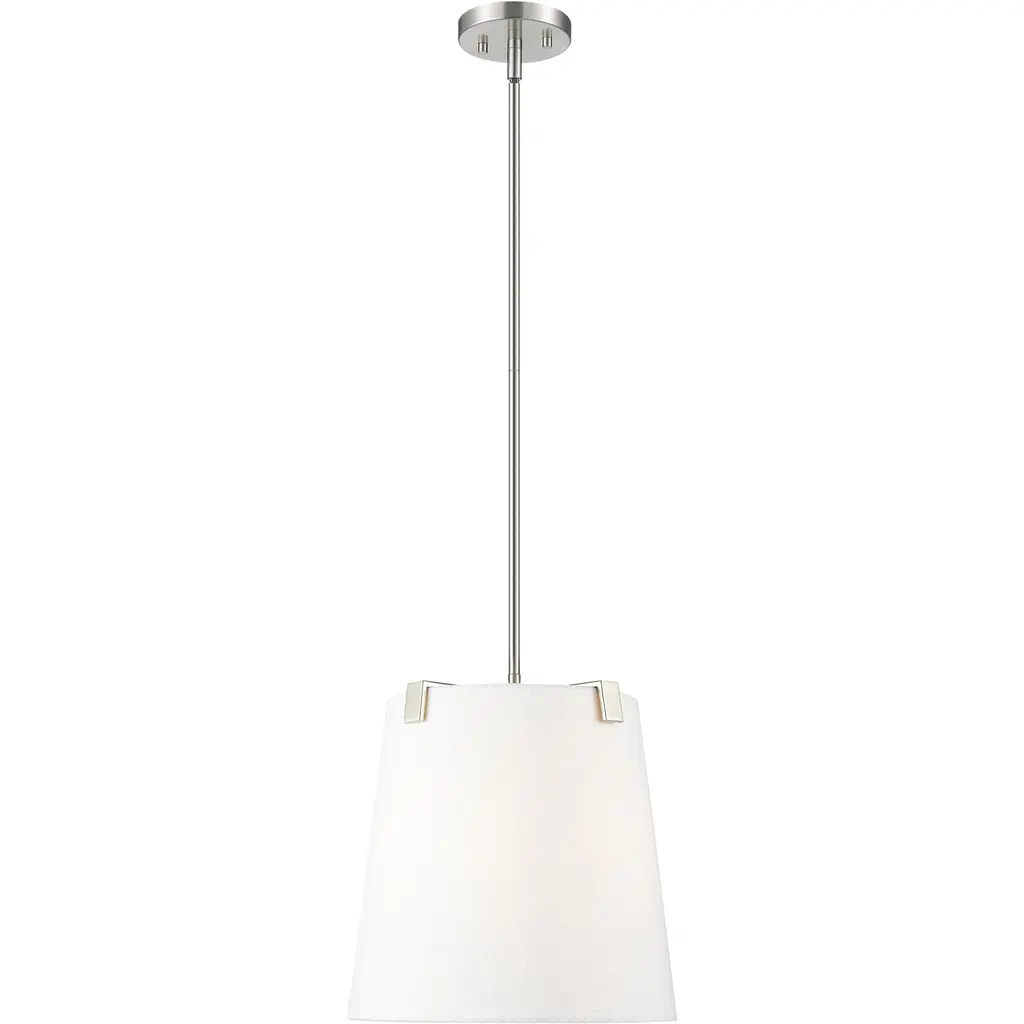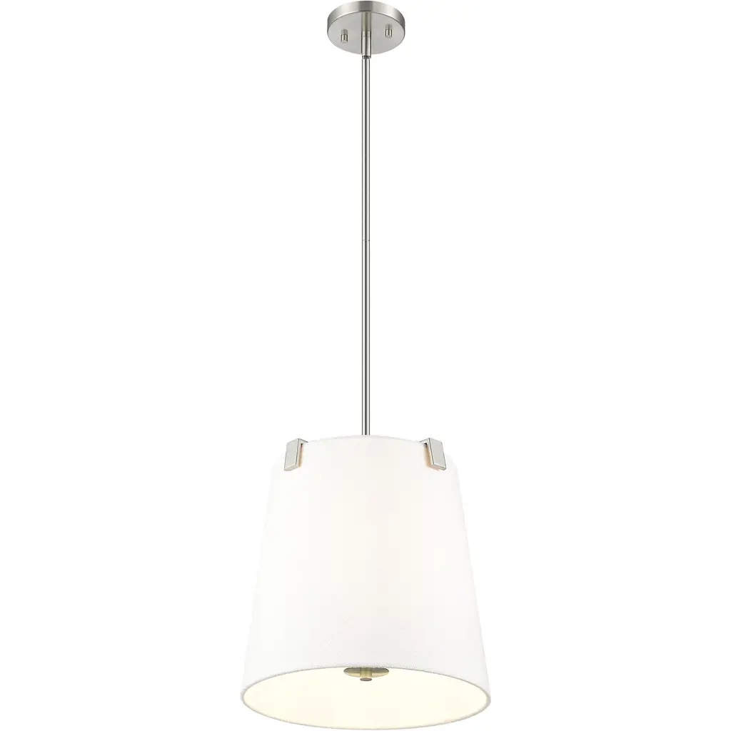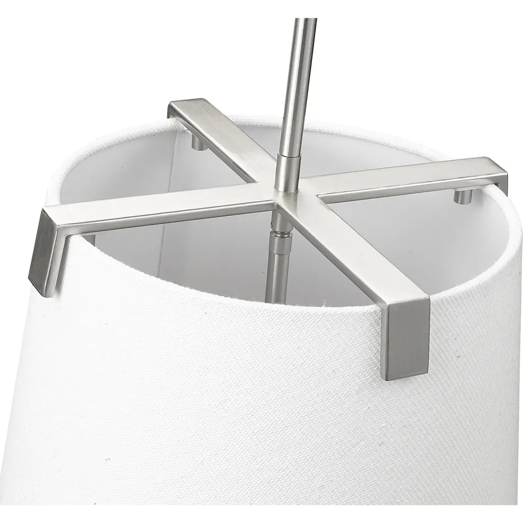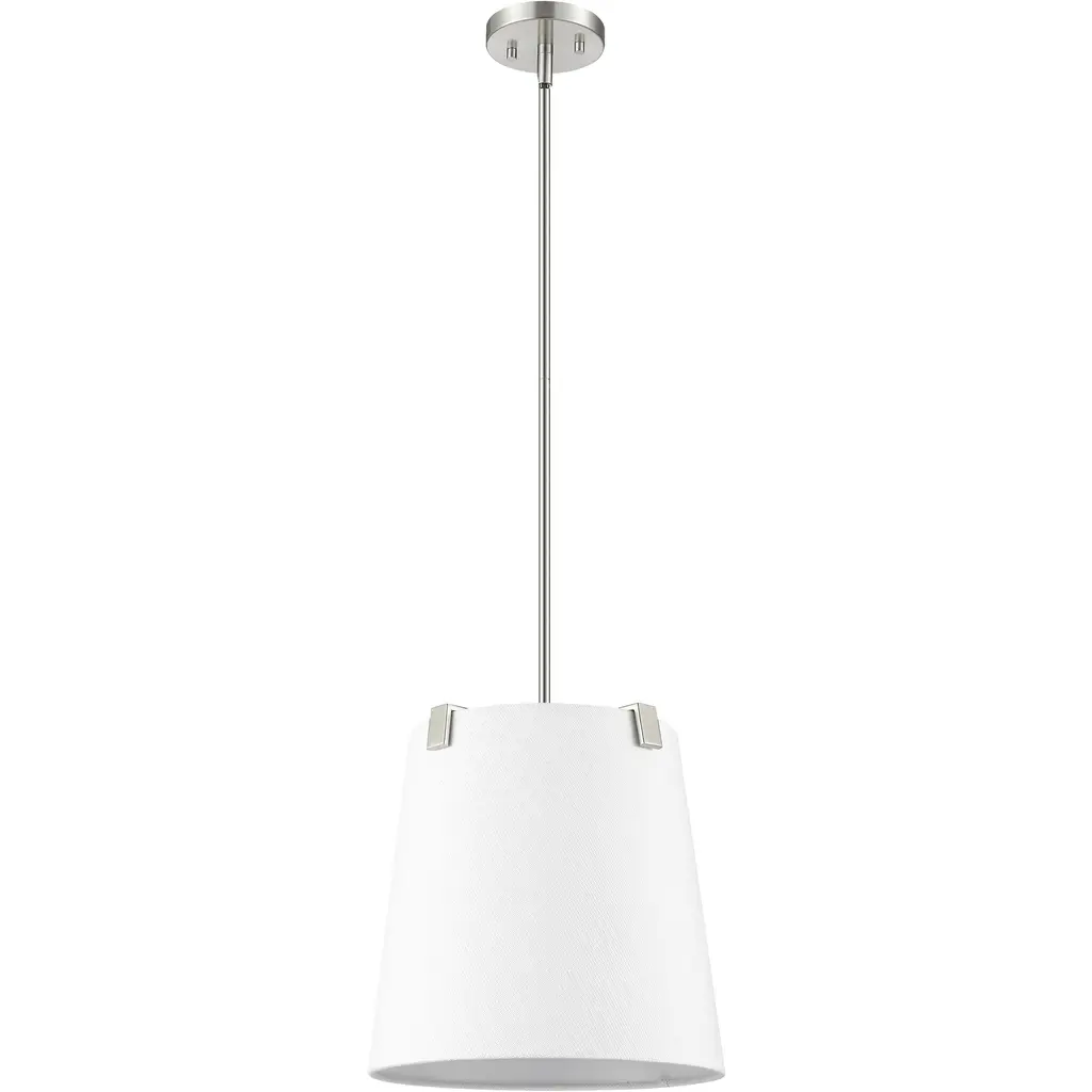 Indulge in a modernized version of traditional lighting with a three-light pendant delivering graceful and fluid design elements. Brushed nickel finish steel framing with clips attaches to a bright white linen fabric shade, offering low-profile elegance, as candelabra lights diffuse illumination beautifully. This fixture is dimmable, creating mood lighting and efficient functionality.