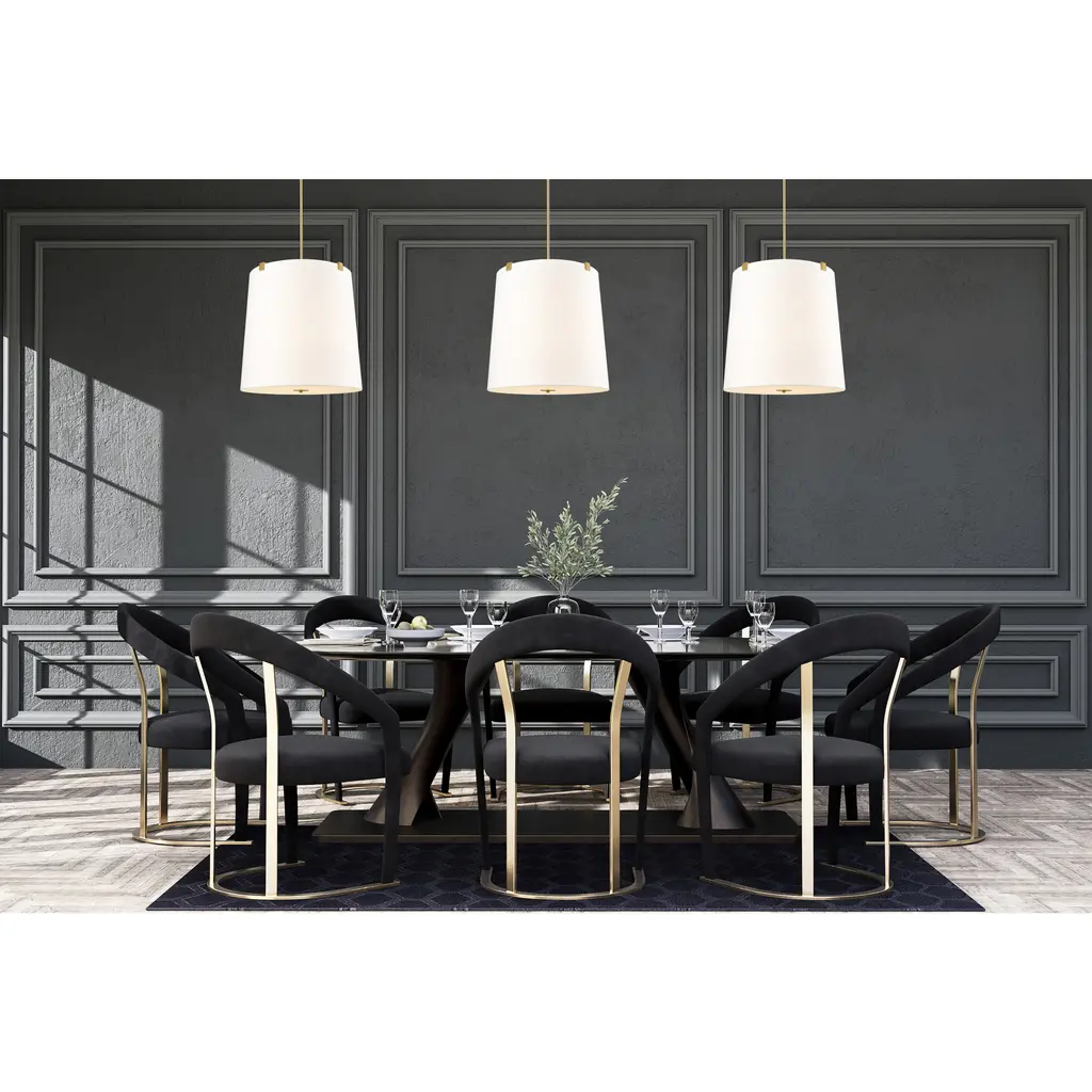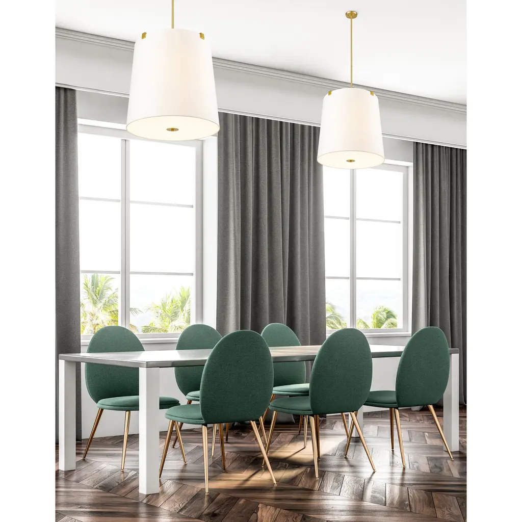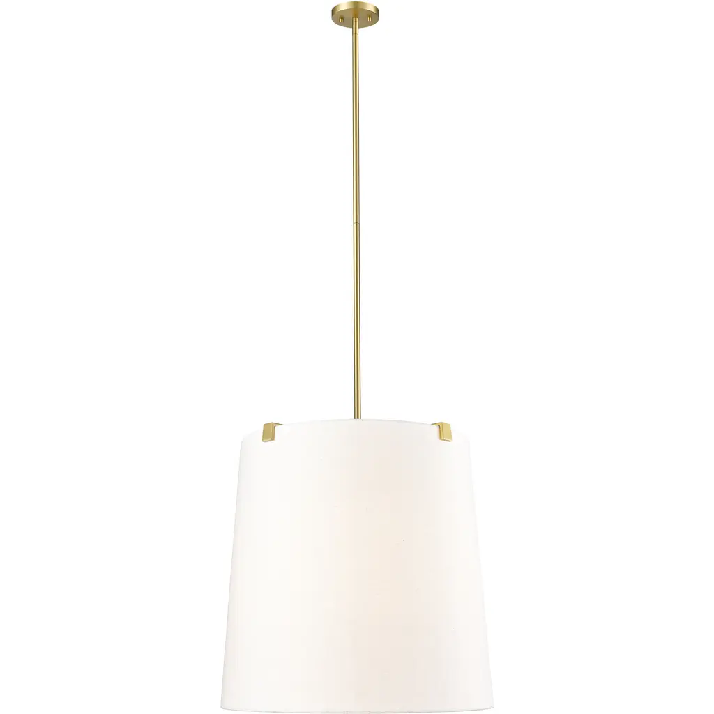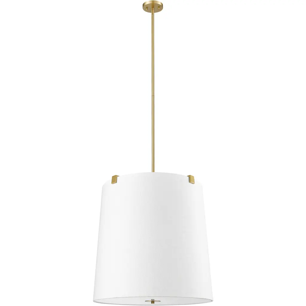 This tastefully styled six-light pendant reflects a tribute to conventional yet chic traditional aesthetic. Cool modern gold finish steel framing with clips attaches to a white linen fabric shade, offering a low-profile vibe, as candelabra lights diffuse illumination beautifully. This fixture is dimmable, creating mood lighting and efficient functionality.