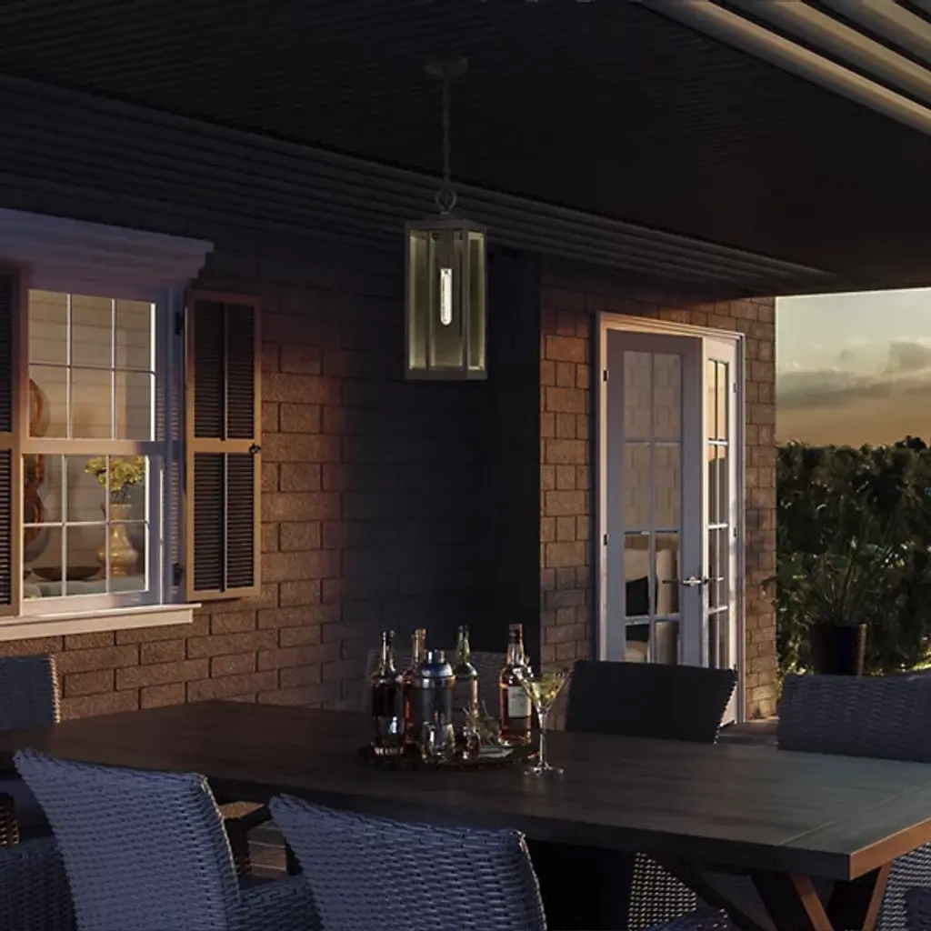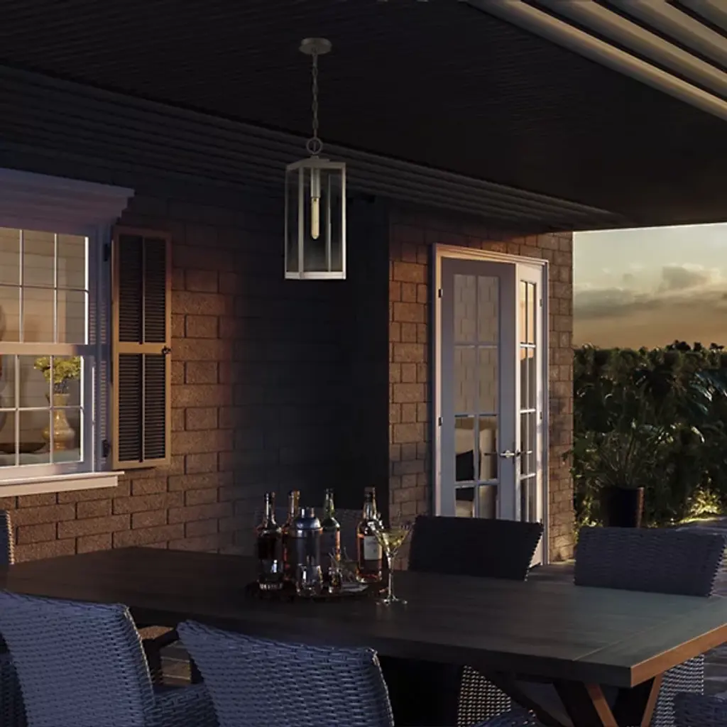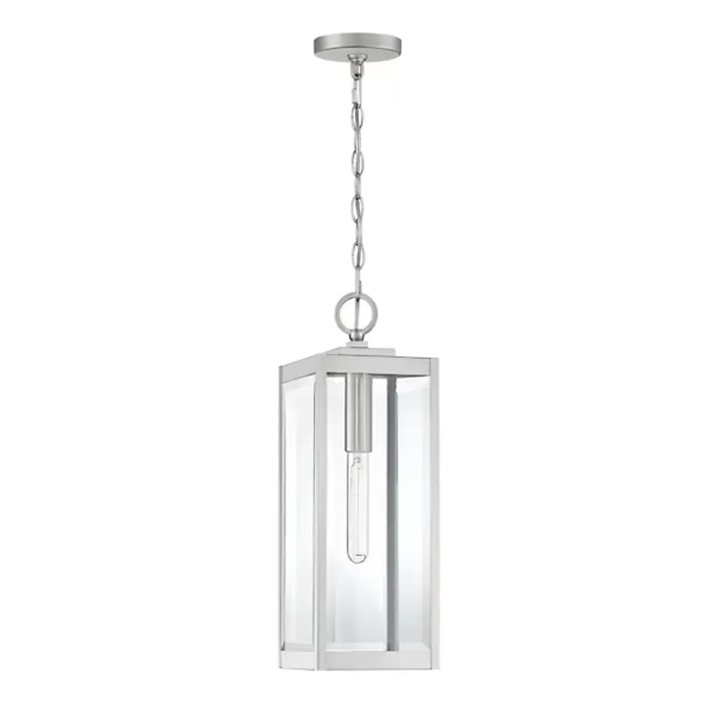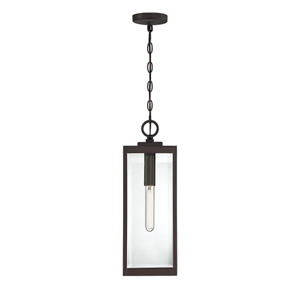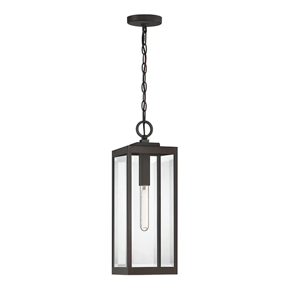 Simple and elegant, the Westover Outdoor Mini Pendant from Quoizel uses clean lines and a tasteful silhouette to instantly enhance your favorite outdoor space. The rectangular body is upheld by a brief chain link connected to a ring finial. Wide panels of clear glass adorn each side, allowing a full view of the elongated, downward-facing bulb resting at the center. The bulb emits a clean and welcoming glow, perfect for announcing your house in an outdoor foyer.