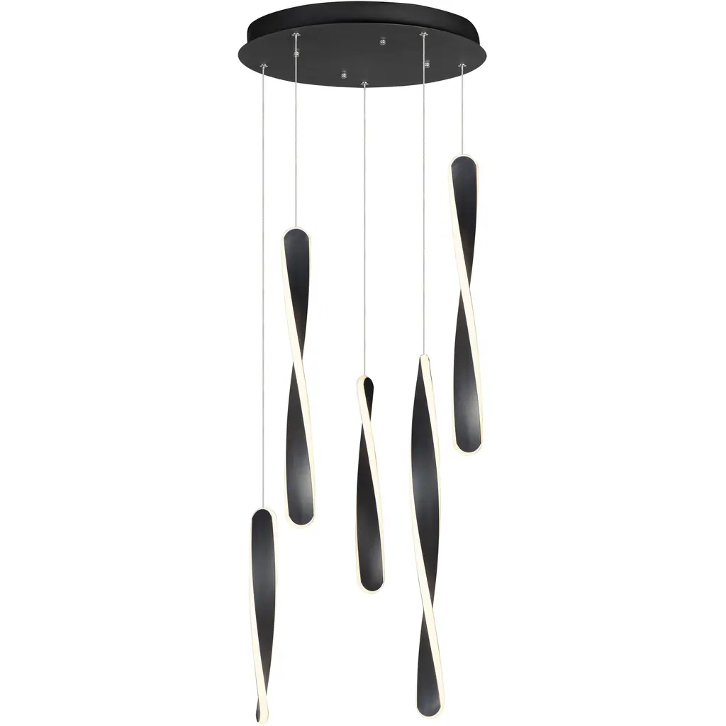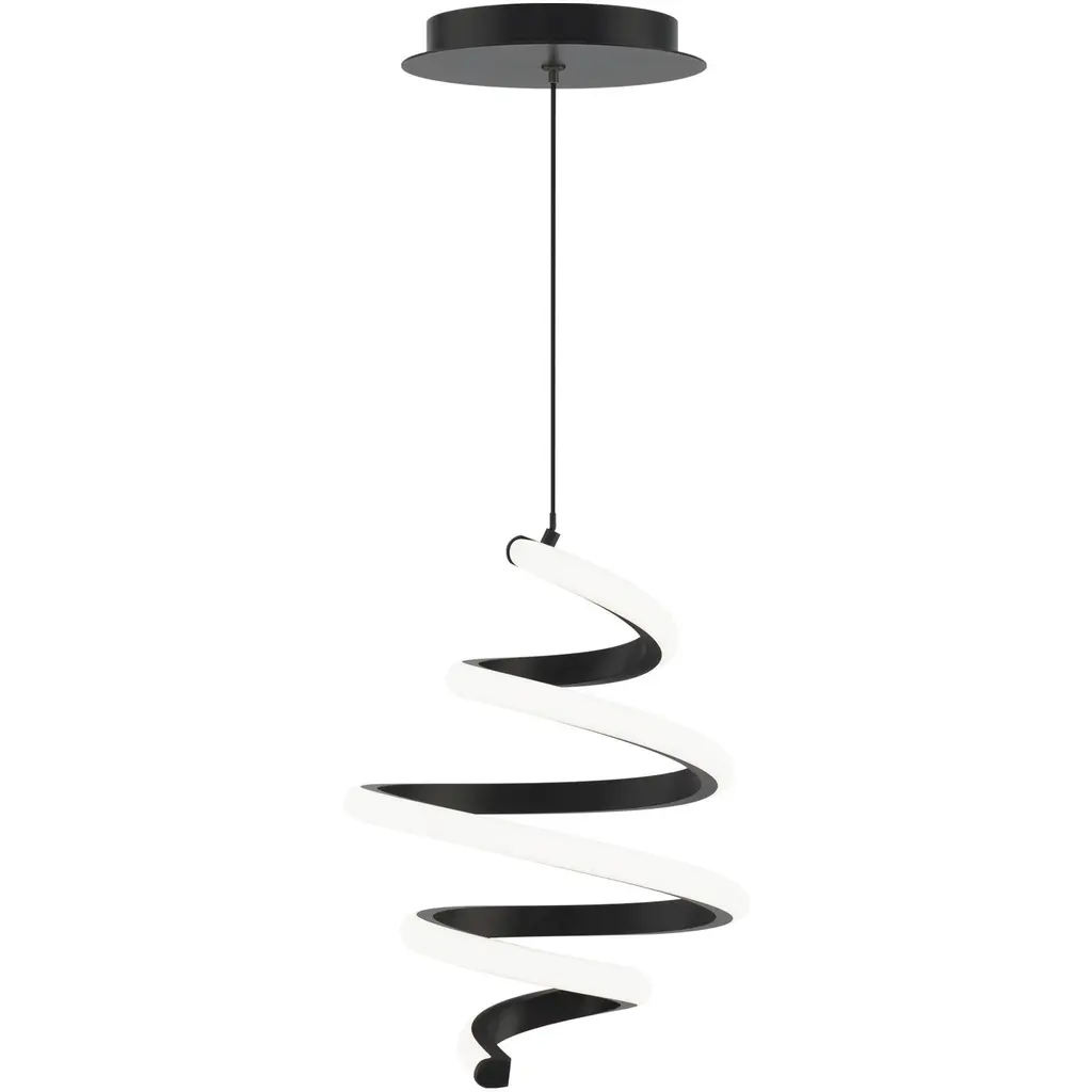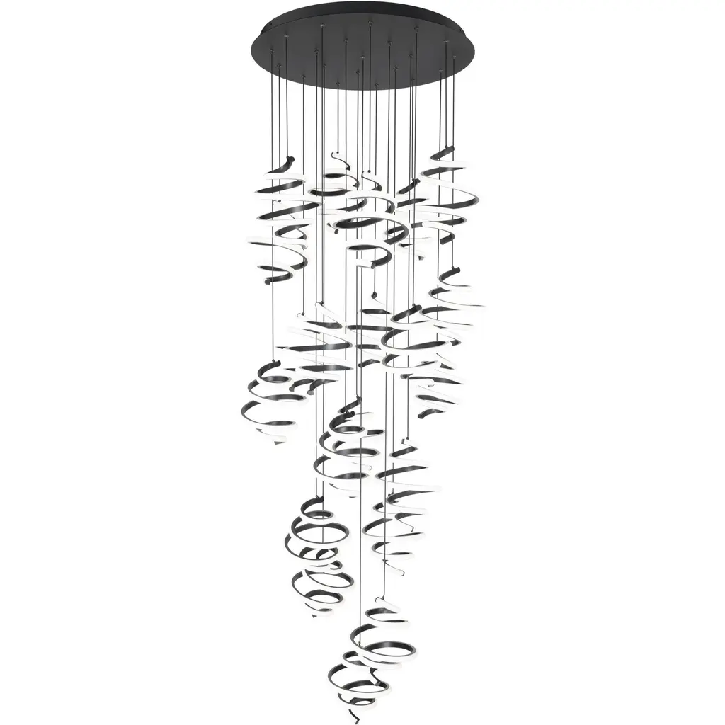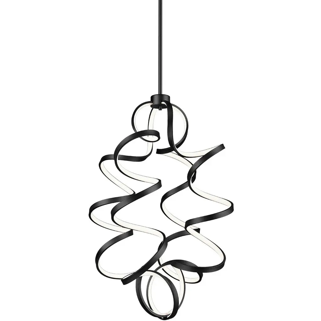 Like a tornado whirling in space, multiple curves of illumination are backed by a black frame and suspended from a cloud-like canopy. Integrated LEDs provide crisp, clean light to modern spaces.