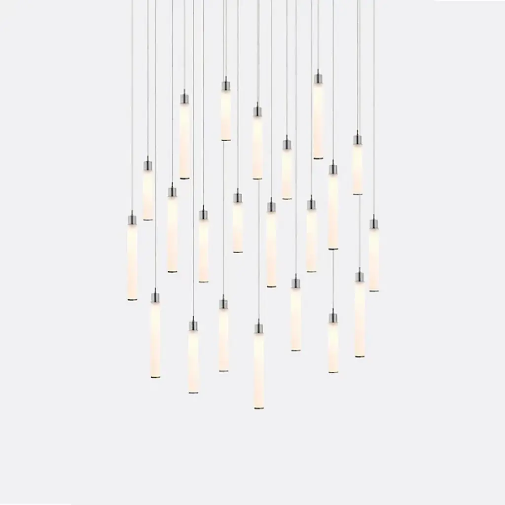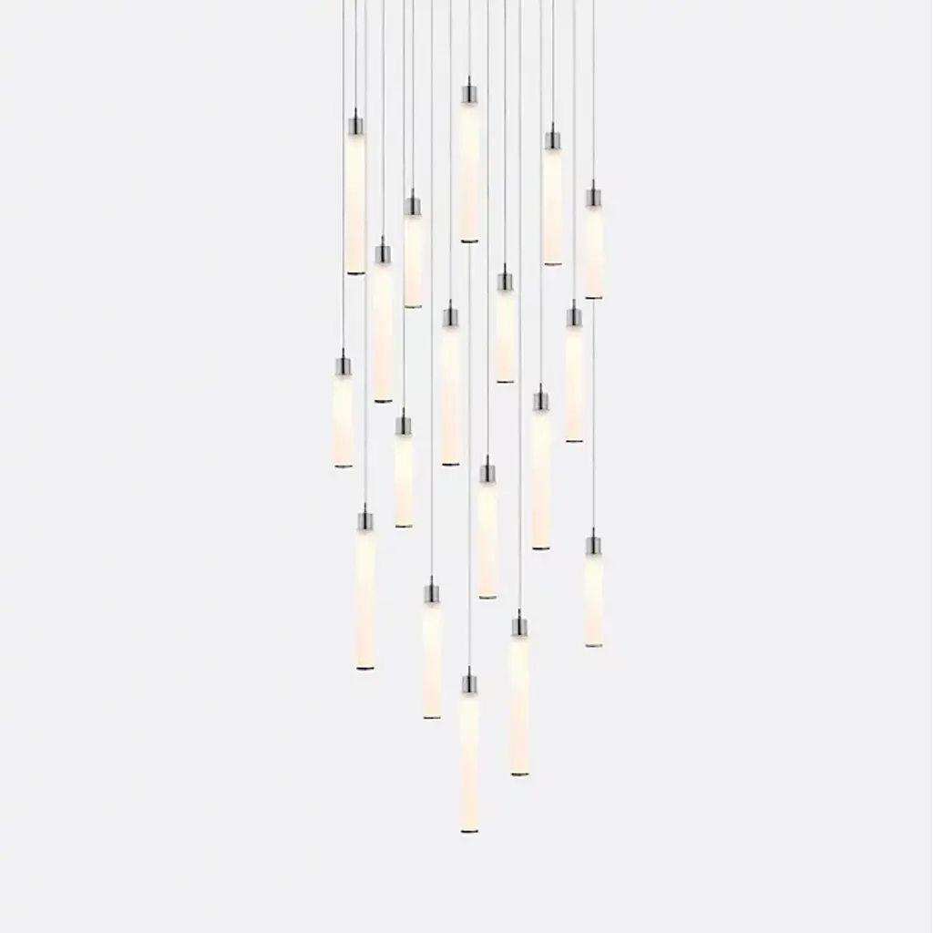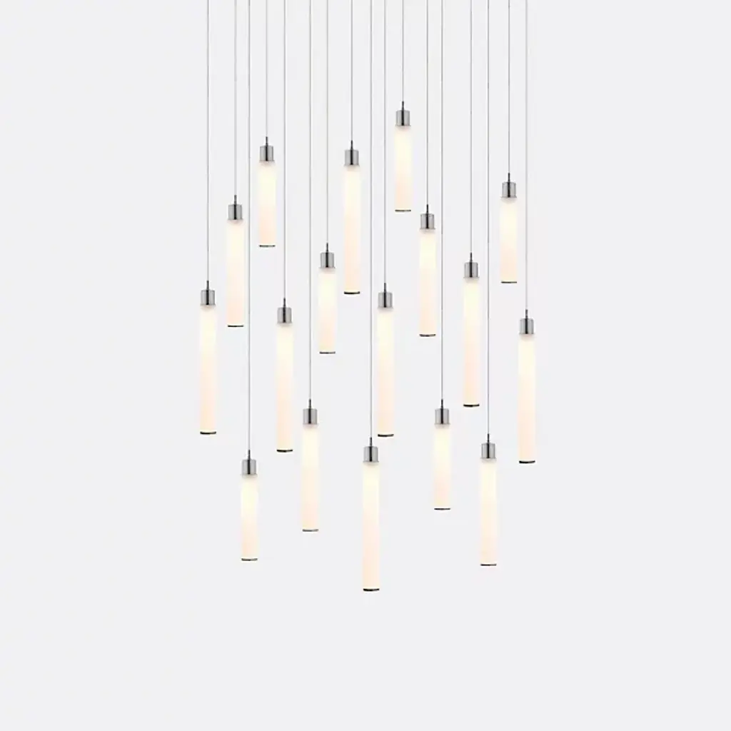 Art-forward and elegant. The White Candle 14 Multi-Light Pendant is presented by Shakuff. It is composed of multiple dangling pendants that display hand-blown glass shades in a cylindrical silhouette. Each one is capped with decorative trim in a luxurious finish. Made in the USA and featuring energy-efficient LED capability as well as sloped ceiling adaptability, this piece of design lighting will transform a space with pleasant illumination and aesthetics.