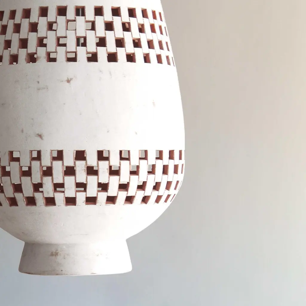 Our Atzompa Collection is created in the Oaxacan town of Santa María Atzompa, where the pottery-making tradition has roots tracing back to ancient Zapotec culture.Building on this tradition, we formed a partnership with master artisan Eligio Zarate, whose family has for generations worked to bring innovation to this centuries-old craft.Using a red clay that comes from local mountains, the pieces in this collection are first given form within custom gesso molds. Emerging from the molds, the repeating openwork designs—which play on motifs that are carved in to the stone at Mitla, the neighboring archeological ruins—are meticulously cut out one by one. Each piece is then brushed with a white wash before being fired in a wood-burning pit.DIMENSIONS16” Ø x 26” h41cm Ø x 66cm hLAMPINGTriple SocketBulbrite, G25, E26 LED (bulbs included)8.5W 60W Equivalent800 Lumens3000K CRI 90+Fully compatible dimmingCERTIFICATIONSUL, cUL listed (120V) 240V available upon requestMOUNTINGUniversal ceiling mount; hardwiredSUSPENSION6 ft link chain (standard)METAL FINISHAged Brass