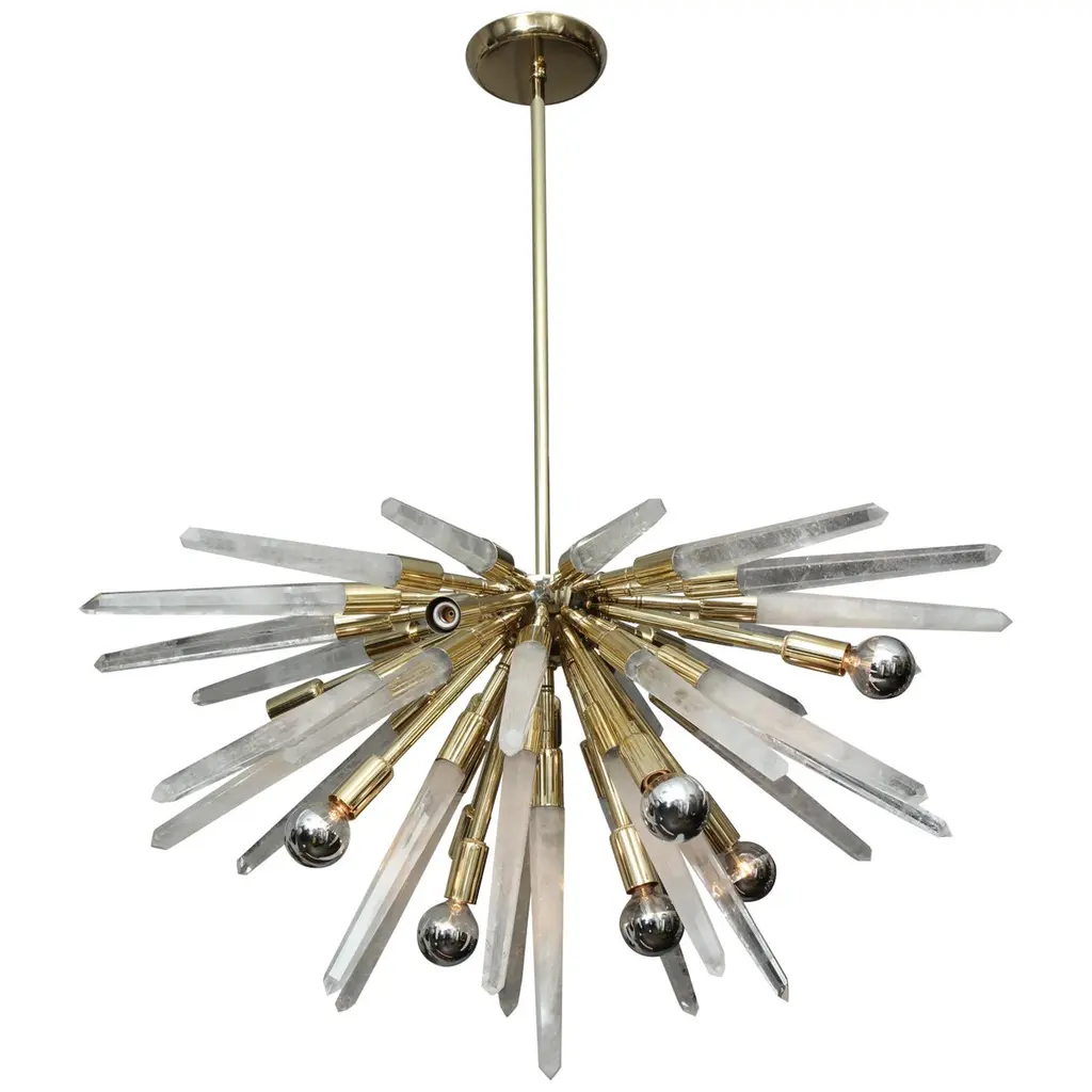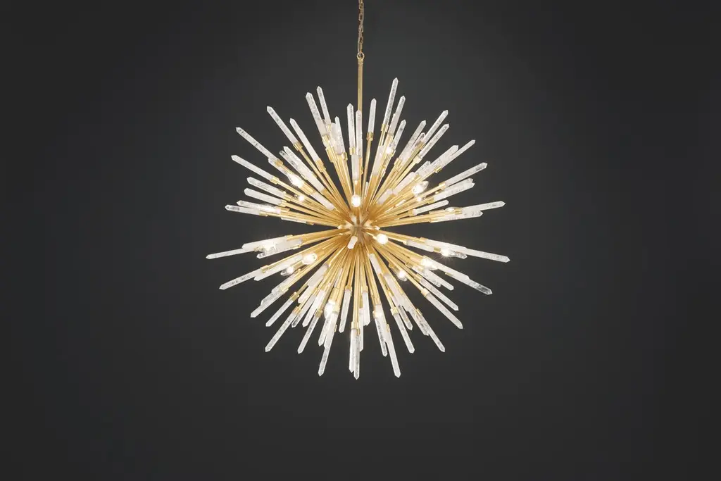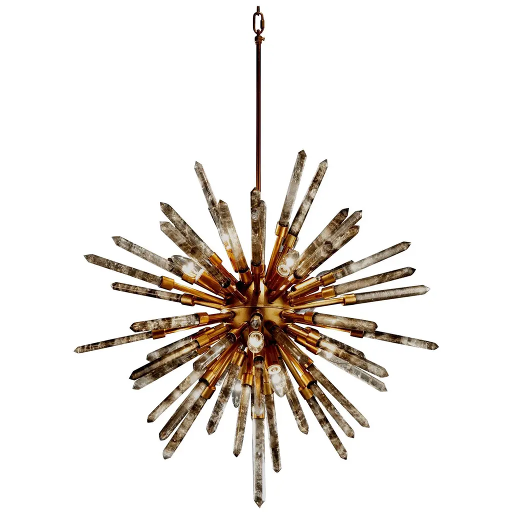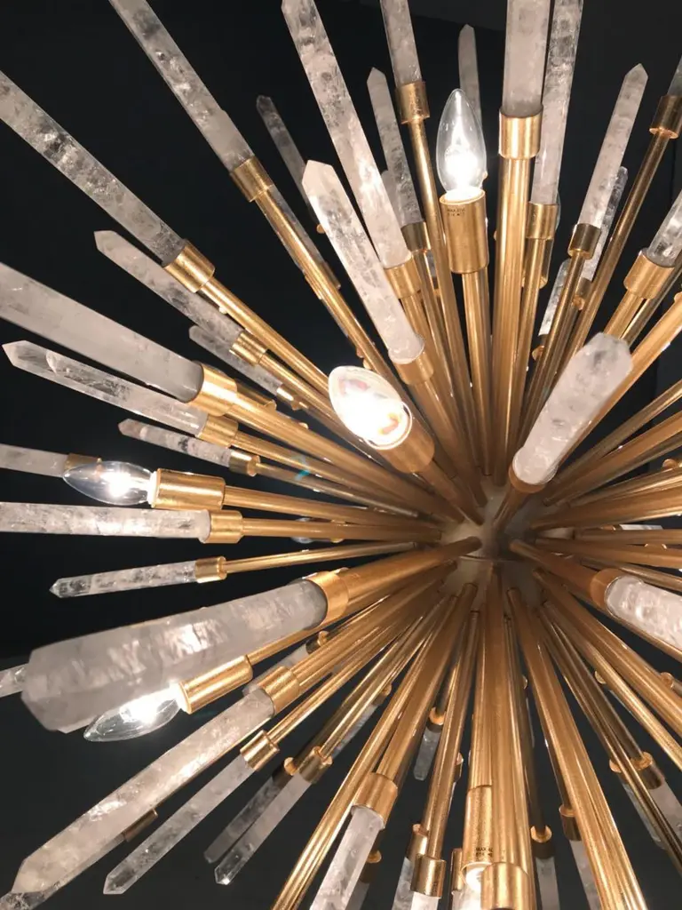 White quartz and copper pendant lamp by AverDimensions: D 84 x W 84 x H 100 cm.Lighting: eighteen E14.Finish: silver leaf, old silver leaf, gold leaf, old gold leaf, copper leaf, rusty, pink golf, brass.Rock crystal: white quartz, smoked quartz.