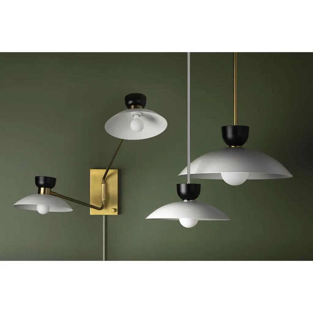Like a flowering lotus, Whitley expands outward, feeling infinite in her reach. Dueling finishes in soft black and white present a yin yang effect, anchored by a crisp metal arm in aged brass or polished nickel. Available as a pendant in two sizes and a dramatic swing arm wall sconce. Not sure where to place the wall light? Try Whitley over a reading banquet or writing desk.