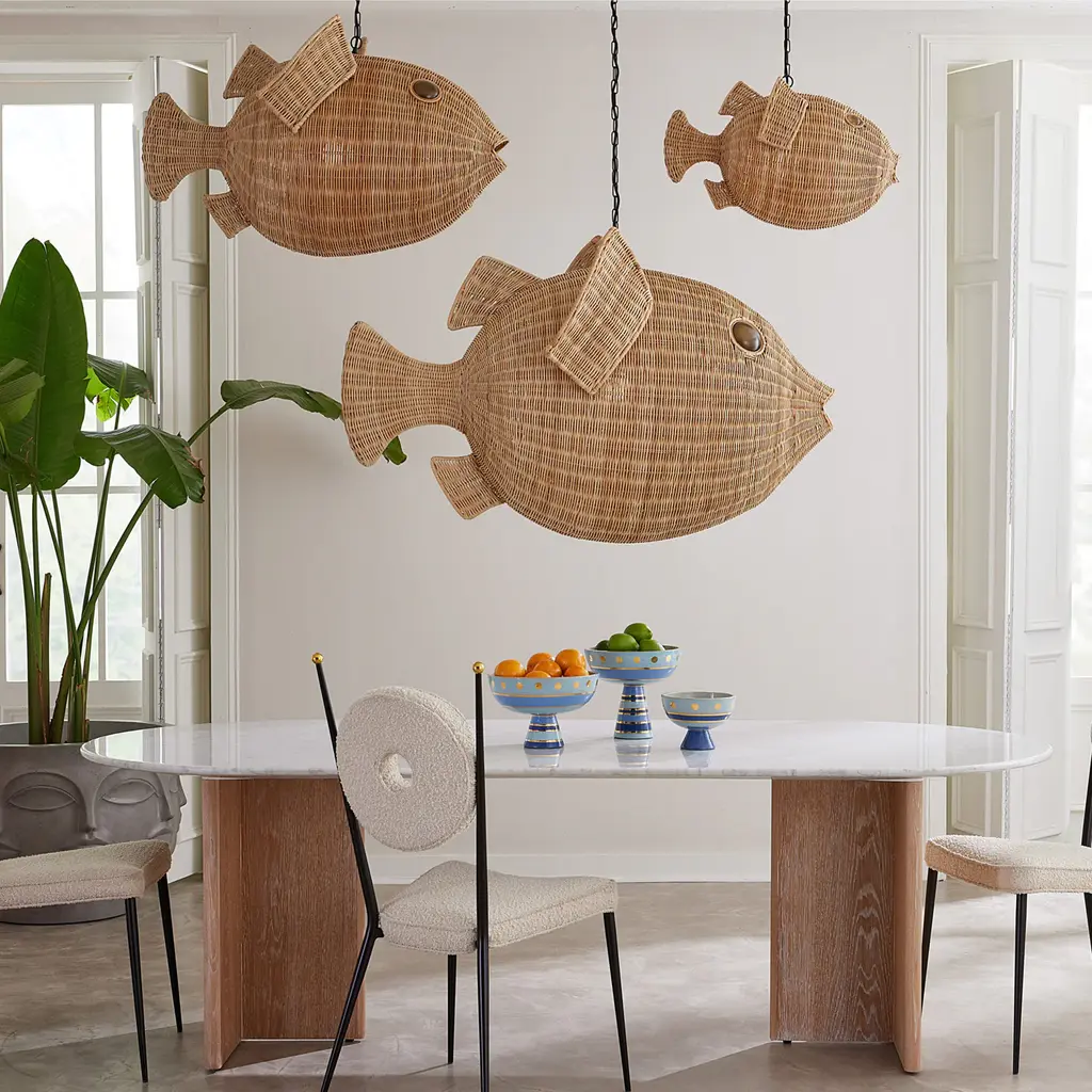 Wild Style. Each of our surreally sized Wicker Blowfish Pendants is weaved by a single artisan over the course of multiple days. After the reeds are hand-soaked and woven, an additional two days is spent trimming and sanding the sculpture by hand. Each piece is then coated with a clear lacquer to enhance the natural rattan coloring. Breezy and tropical in an entry or floating about your cocktail table, drop a single small pendant for seasisde vibes in a powder room, or line a chic school above your counter or long dining table. We also love them at staggered heights in a palatial pad. All lighting sales are final.