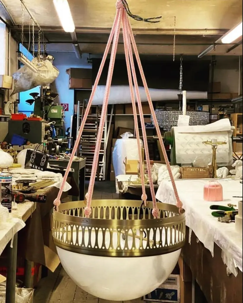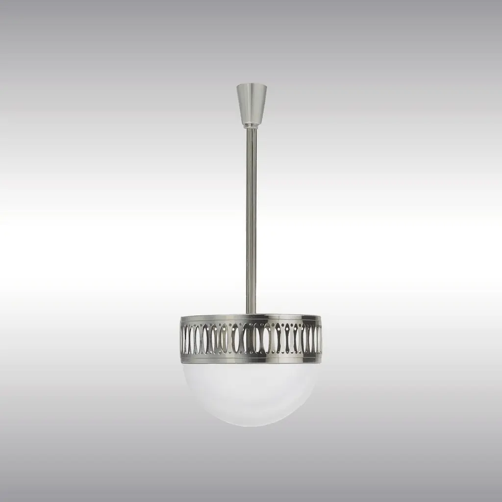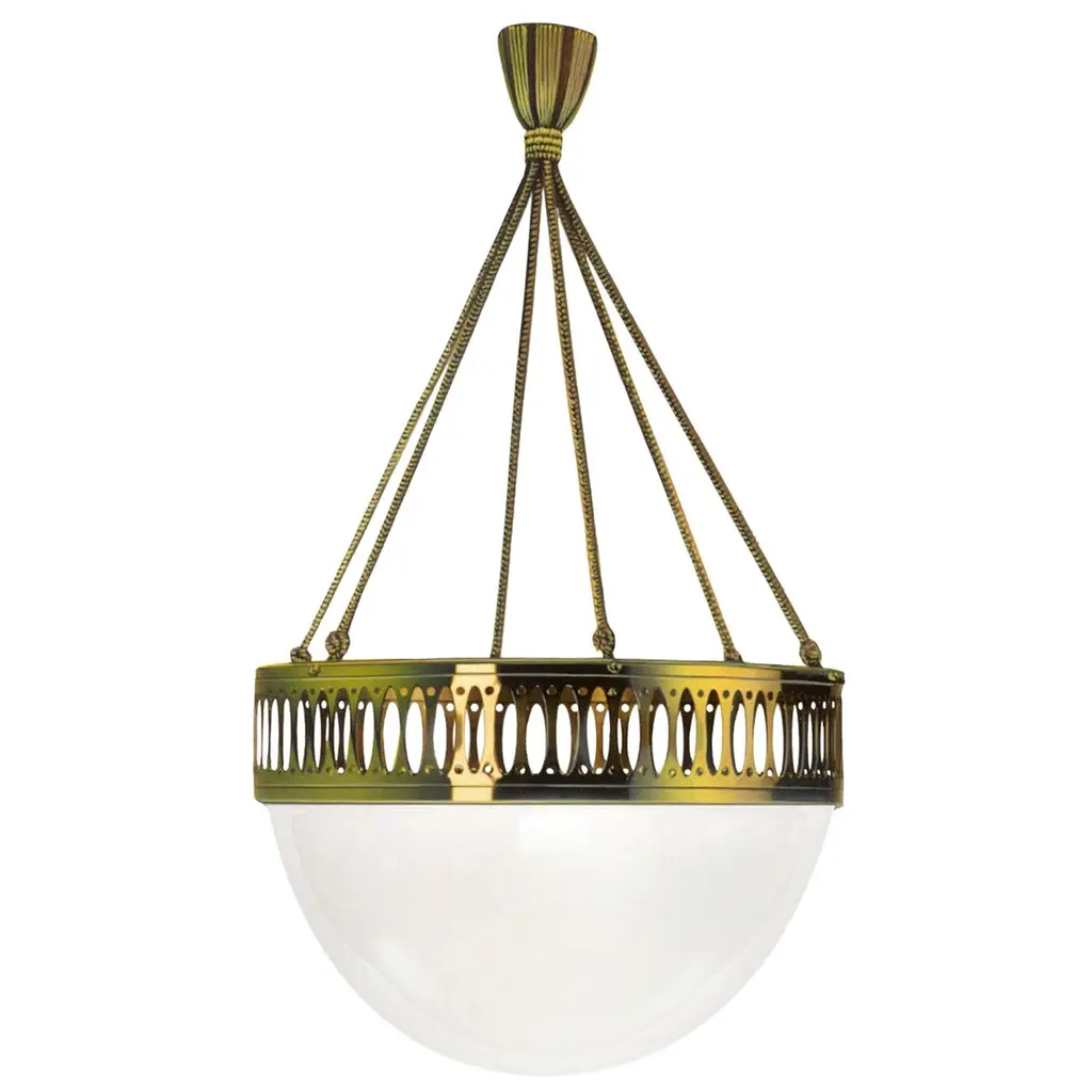 Punched brass-sheet, hand blown Opaline glass 35 or 50 cm in diameter, hanging on cords with brass balls.Different variations are available see our pictures!Most components according to the UL regulations, with an additional charge we will UL-list and label our fixtures.