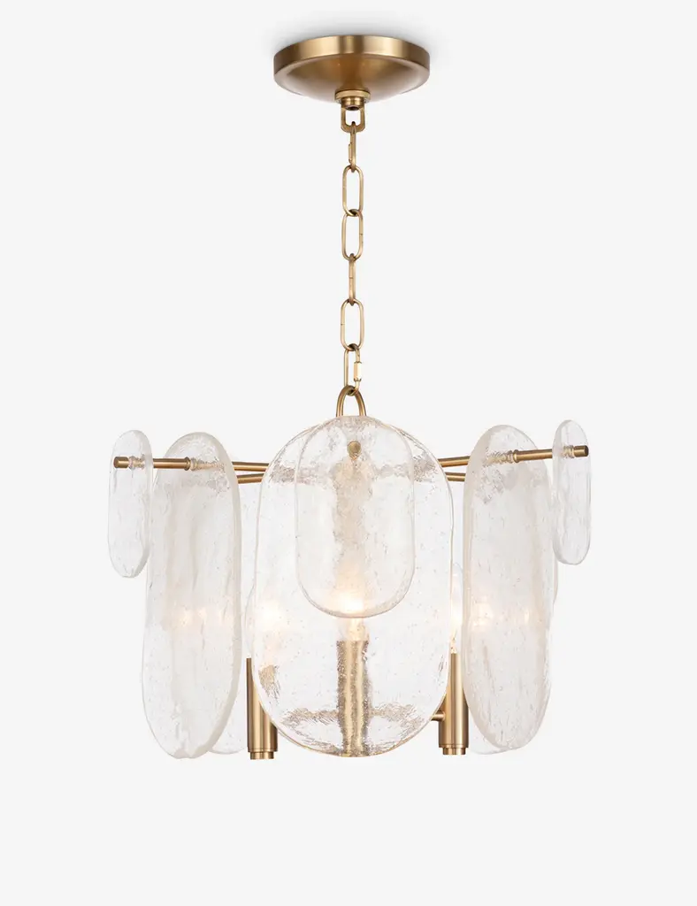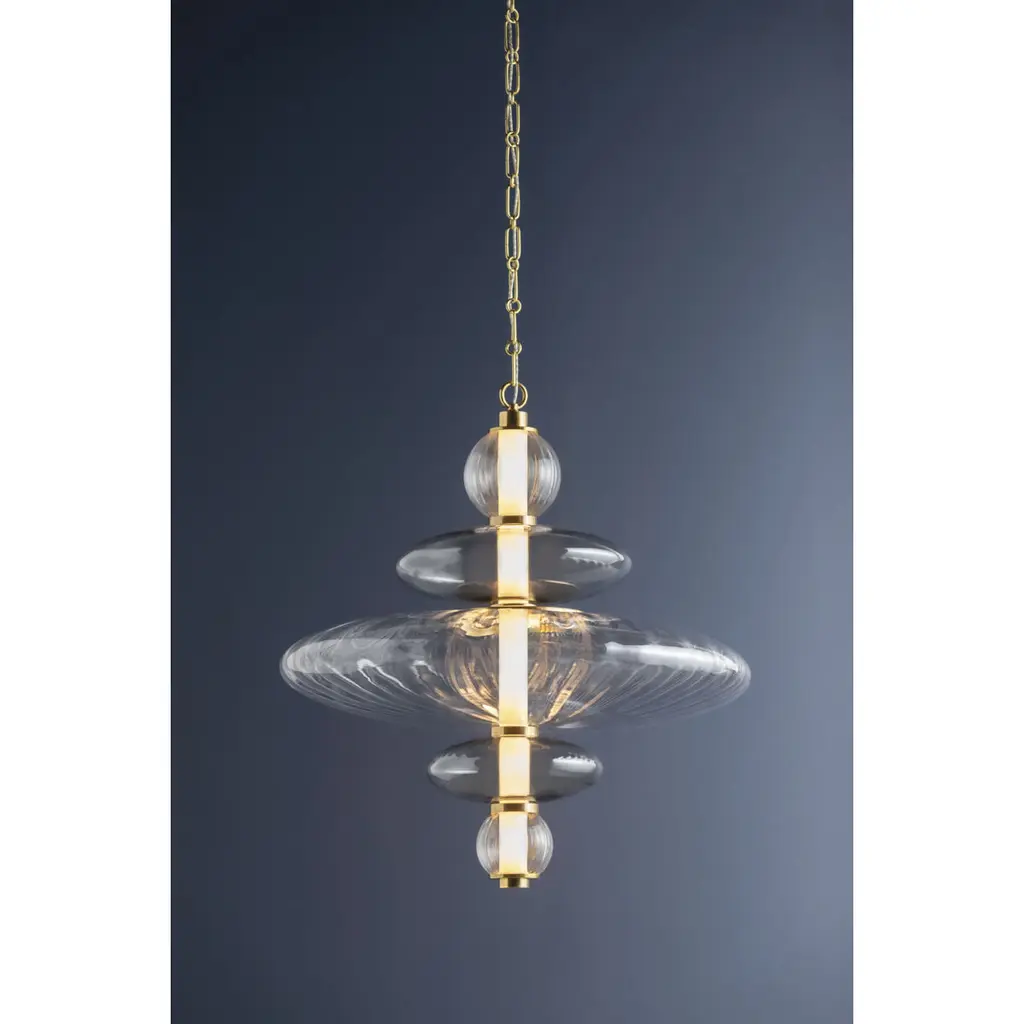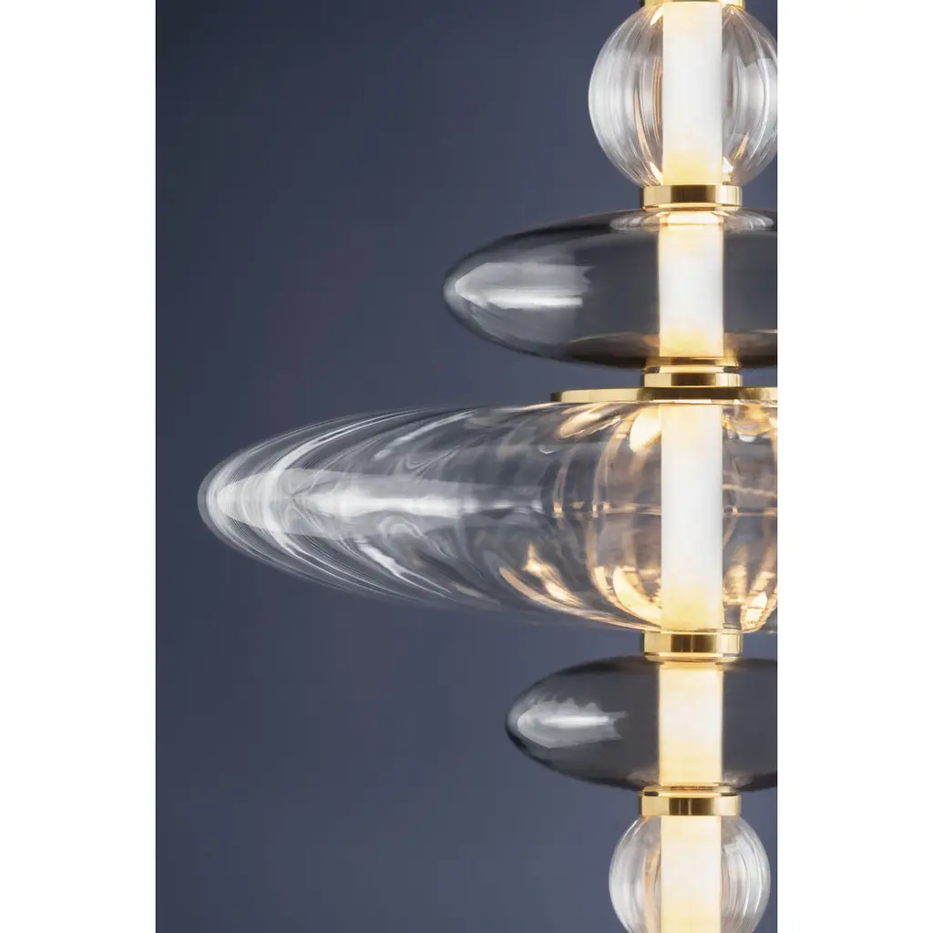 Old meets new in the nostalgic Williams pendant. Streamlined renditions of classic glass techniques are stacked to create a striking totemic composition. Alternating clear optic and smoked glass shades are stacked around a single LED tube, which serves as the core of this eye-catching fixture. Williams is available in two sizes and is finished in Aged Brass.