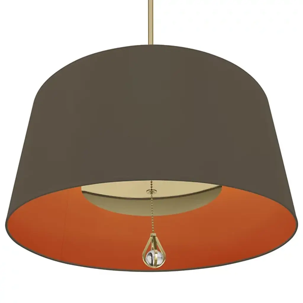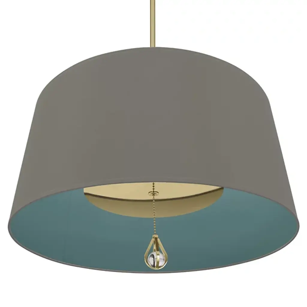 Traditionally trendy. The Robert Abbey Williamsburg Custis Pendant matches a simply elegant silhouette with on-trend color combinations to create a chic look. The drum shaped-shade has contrasting inner and outer colors, finished with a dangling lead crystal finial. As part of the WILLIAMSBURG collection, the Custis is designed and manufactured in the United States with inspiration taken from antique colonial art.