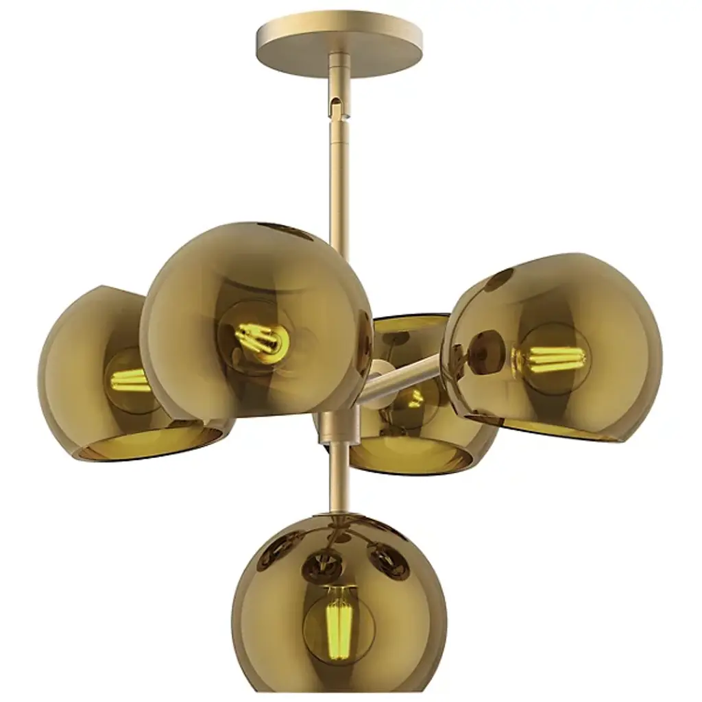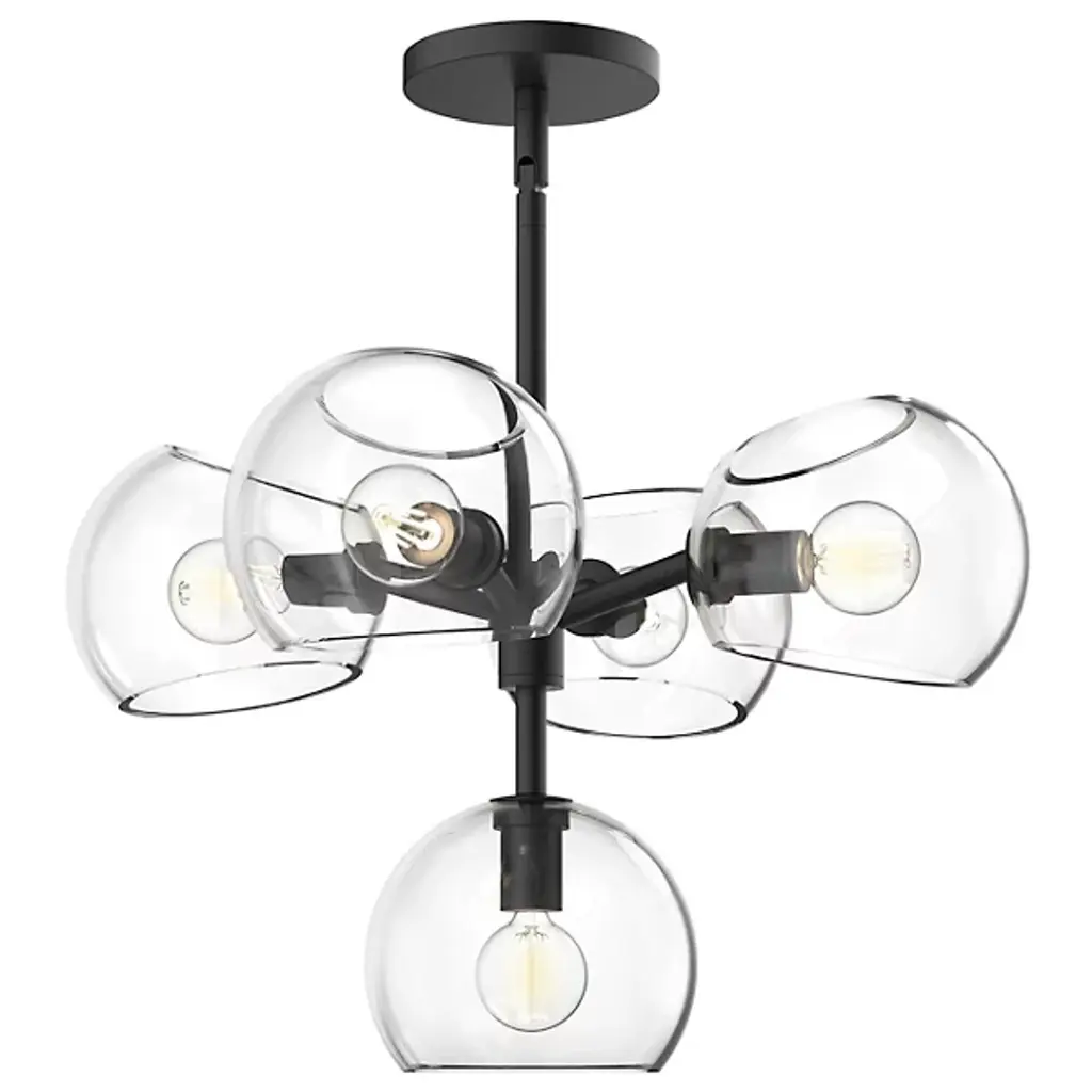 Lend an open modern presence to inside spaces with the Willow 5-Light Pendant from Alora Mood. It incorporates an array of lamping into a simple structure, relying on a single downrod to secure a series of candelabra-style lamps at each end of four short arms, with one blazing out below. A series of angle-cut glass orb shades extend around the lamping, juxtaposing a lower dome-shaded lamp with the open top and bottom of the shades that extend to the sides.
