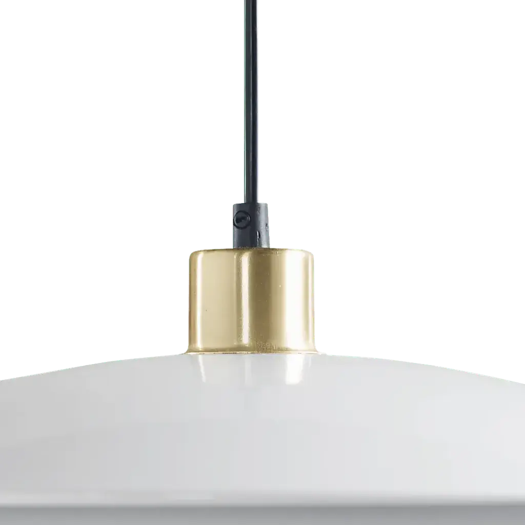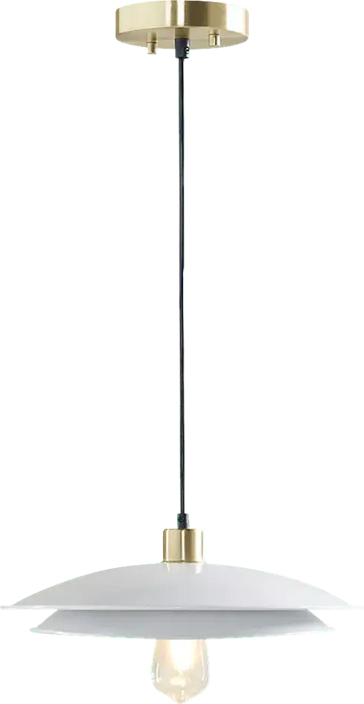 The Winder Summit White Pendant provides a simple and classic addition to your dining room or kitchen decor. This single bulb hanging pendant features a double layered disc shade, in a matte white finish, to create a mid-century modern design. The gold ceiling base complements the shade, for a striking look. Elevate and brighten your space with the unique and eye-catching style of this pendant light. Professional installation by an electrician is recommended.