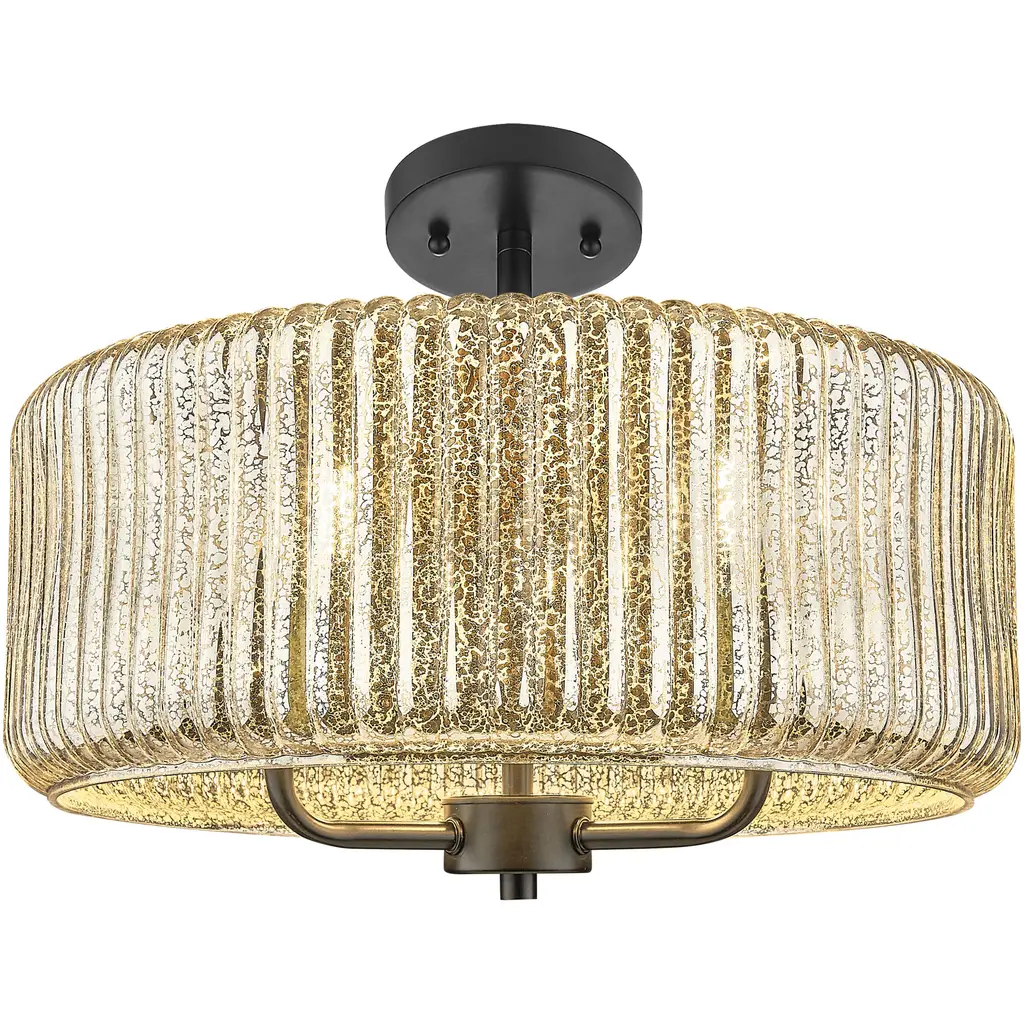 Featuring a ribbed, drum-shaped round glass pendant, this collection brings a touch of vintage allure with modern sensibility. The three lights are gracefully suspended from a central port by delicately curved arms, offering a soft glow that enhances the