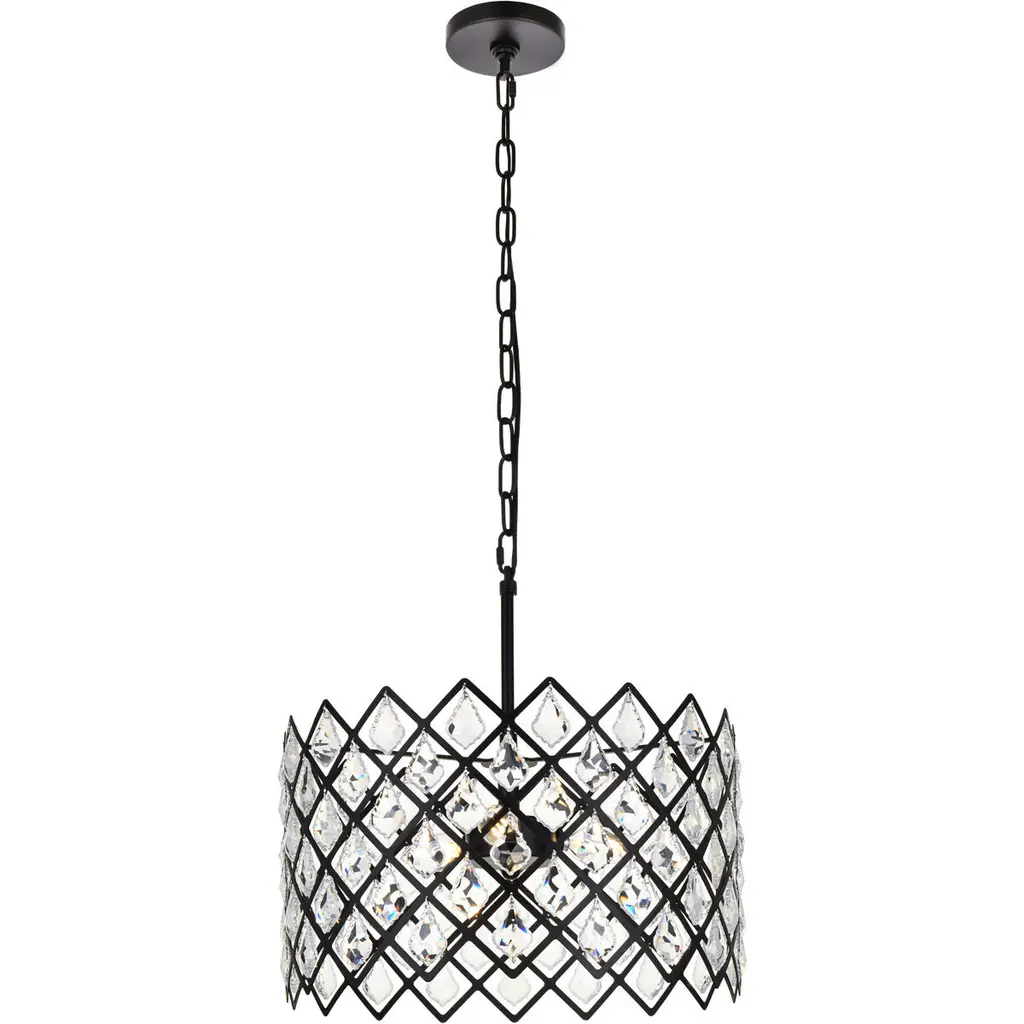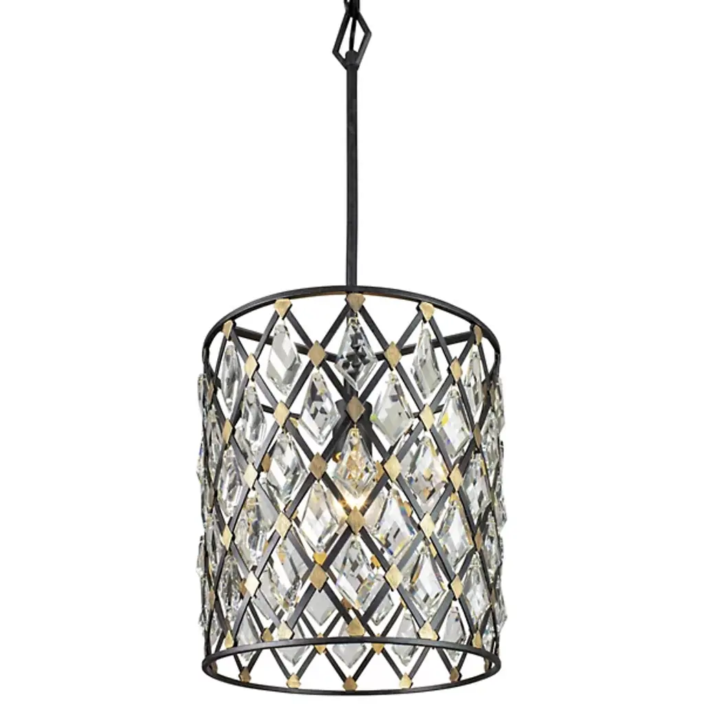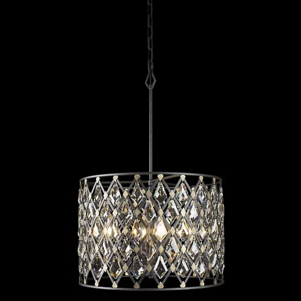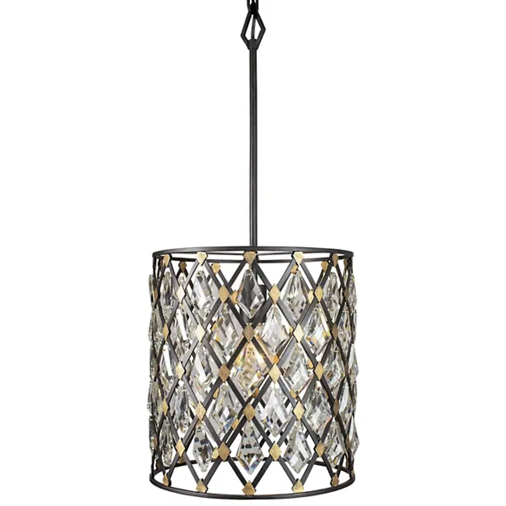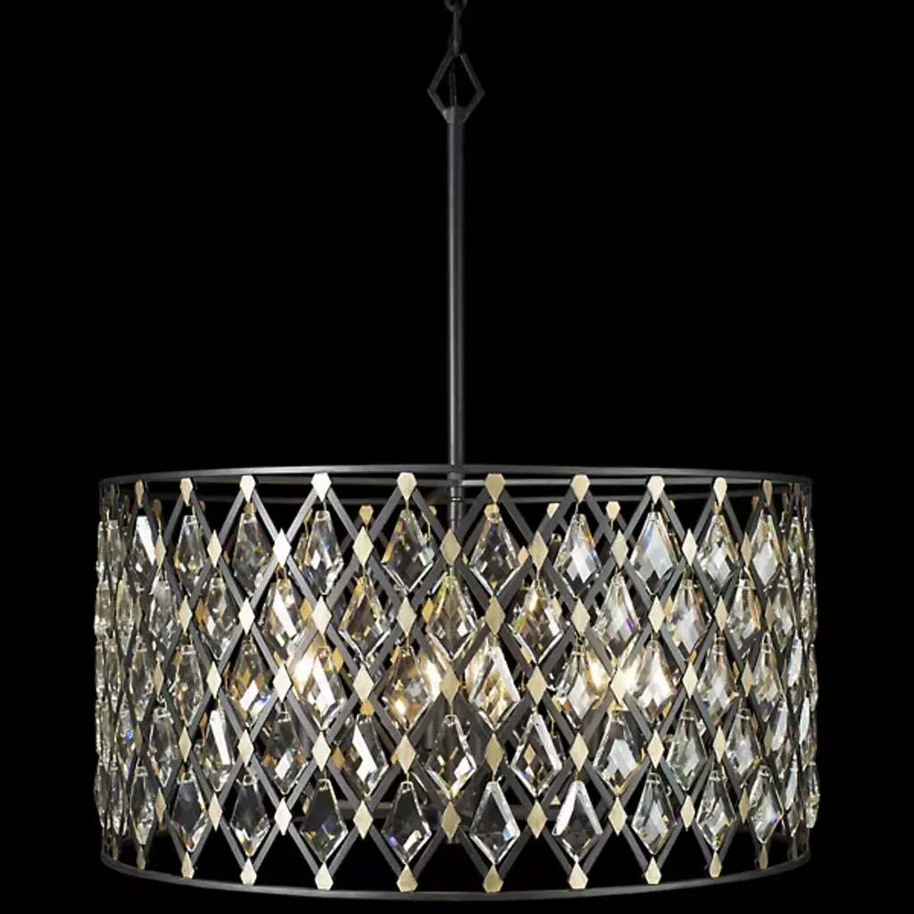 The ideal way to bring a regal touch to modern spaces. With a design inspired by royal tiaras, the Windsor Pendant by Varaluz pairs the clean lines of a drum with the dynamic sparkle of Optic Crystal. It features numerous kite-shaped crystal pendalogues hanging within a double harlequin frame. The frame is hand-forged recycled Steel in contrasting finishes. The hanging crystals effectively camouflage the light sources within and transform the light they produce into shimmering ambience. This modern pendant adds a touch of richness into any space, from dining rooms to kitchens.