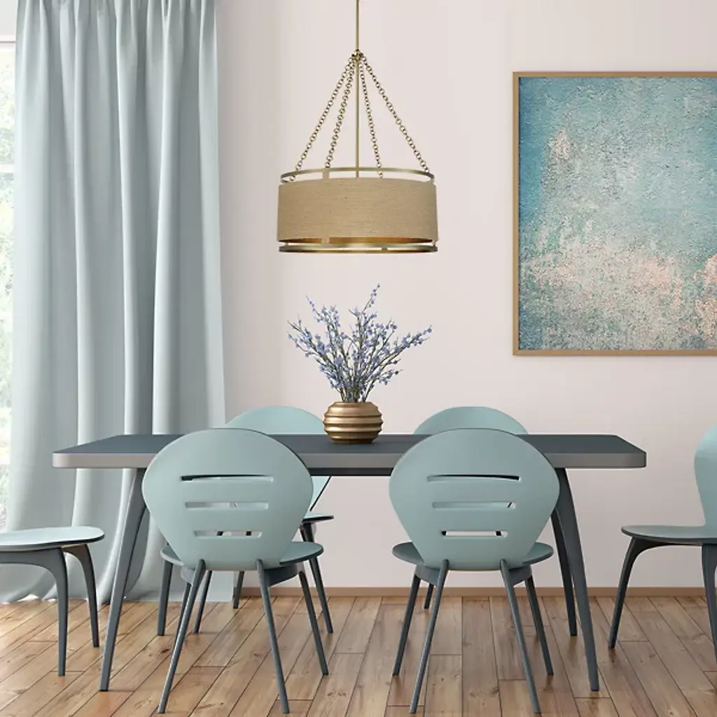 The Windward Passage Drum Pendant by Minka-Lavery is a handsome addition to spaces. With a drum-shaped shade made from brass that is neatly wrapped with rope, this piece has a textured, layered feel as a set of candelabras shine within its form. A set of sleek metal bands add a tailored, decorative touch to this design as they frame either side of this cool shade as a single down rod paired with linked chains support this piece.