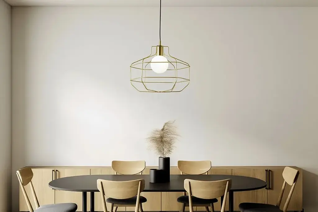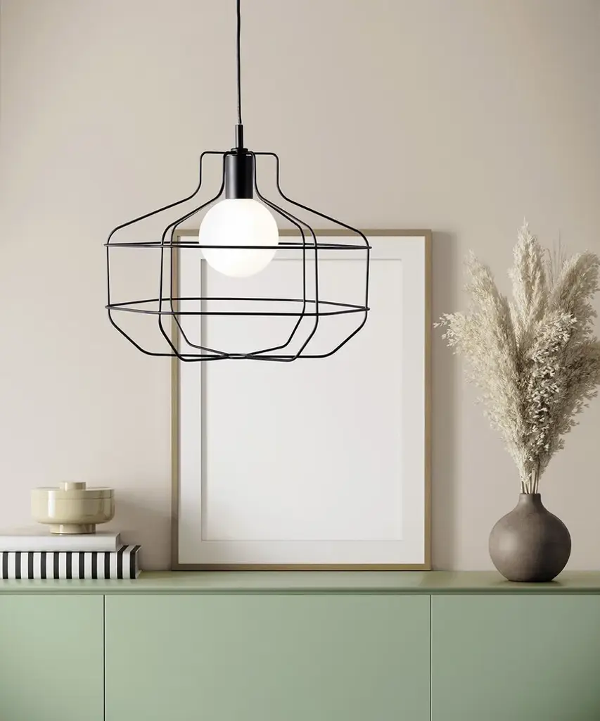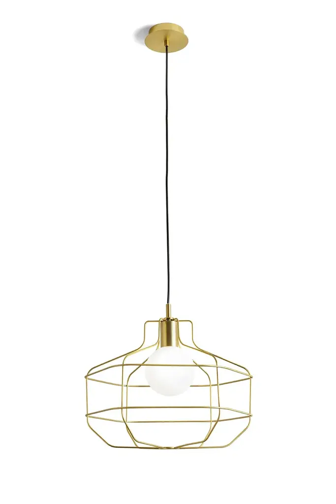 WIRE is a suspension lamp with metal rod frame in brushed gold or painted matte black finish. Internal opal glass diffuser. Brushed gold or painted black matte ceiling cover. Black 200 cm power supply cord. Compatible with G9 LED light bulbs. Source G9 LED | Power 1 x max 10w