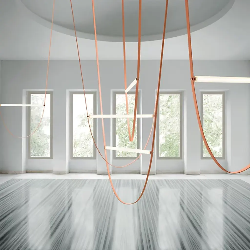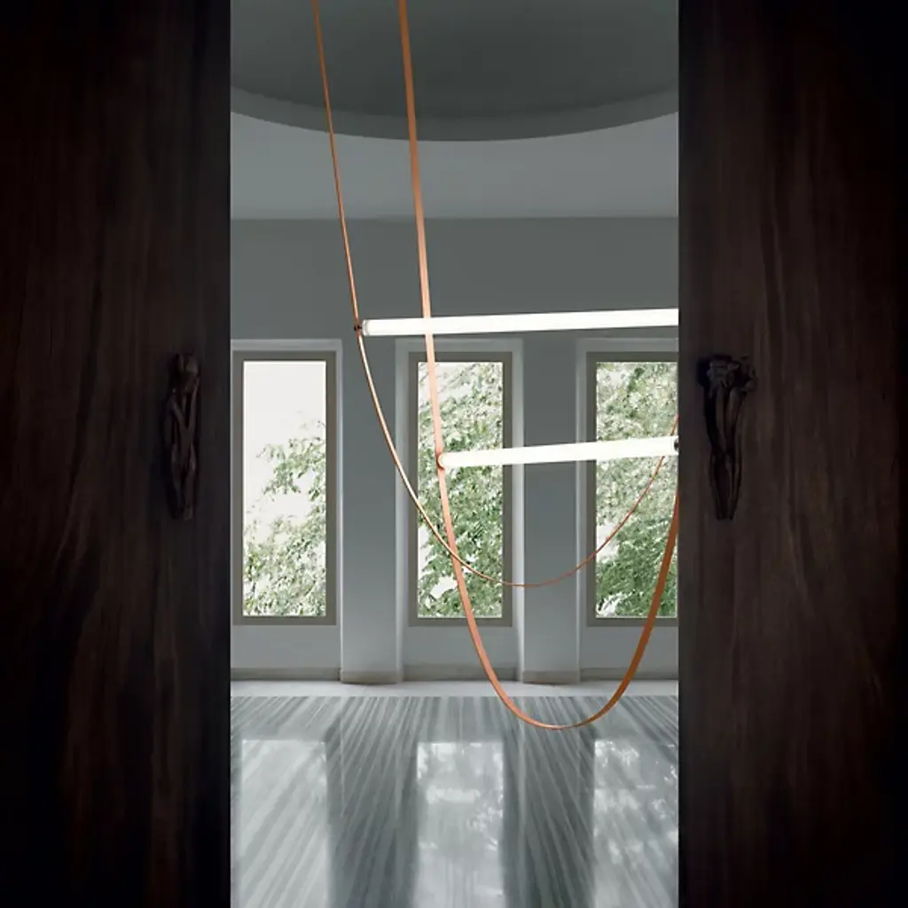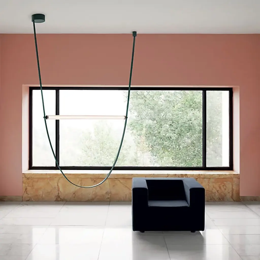 The Wireline LED Pendant Light by FLOS expresses an elegant blend of industrial simplicity and artistic refinement. An inspired design by Andrea Trimarchi and Simone Farresin, it uses a flexible rubber arc suspended from above as a fixture body and a means of suspending its lamping, which is comprised of a long LED integrated into a horizontally-ribbed extruded borosilicate glass cylinder. This fabulously functional design cuts direct glare, exchanging it for a warm, even ambiance in all directions while making a lasting impression.