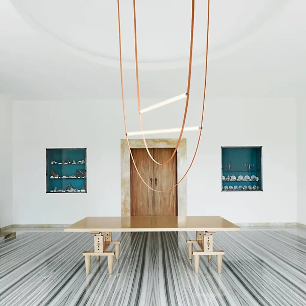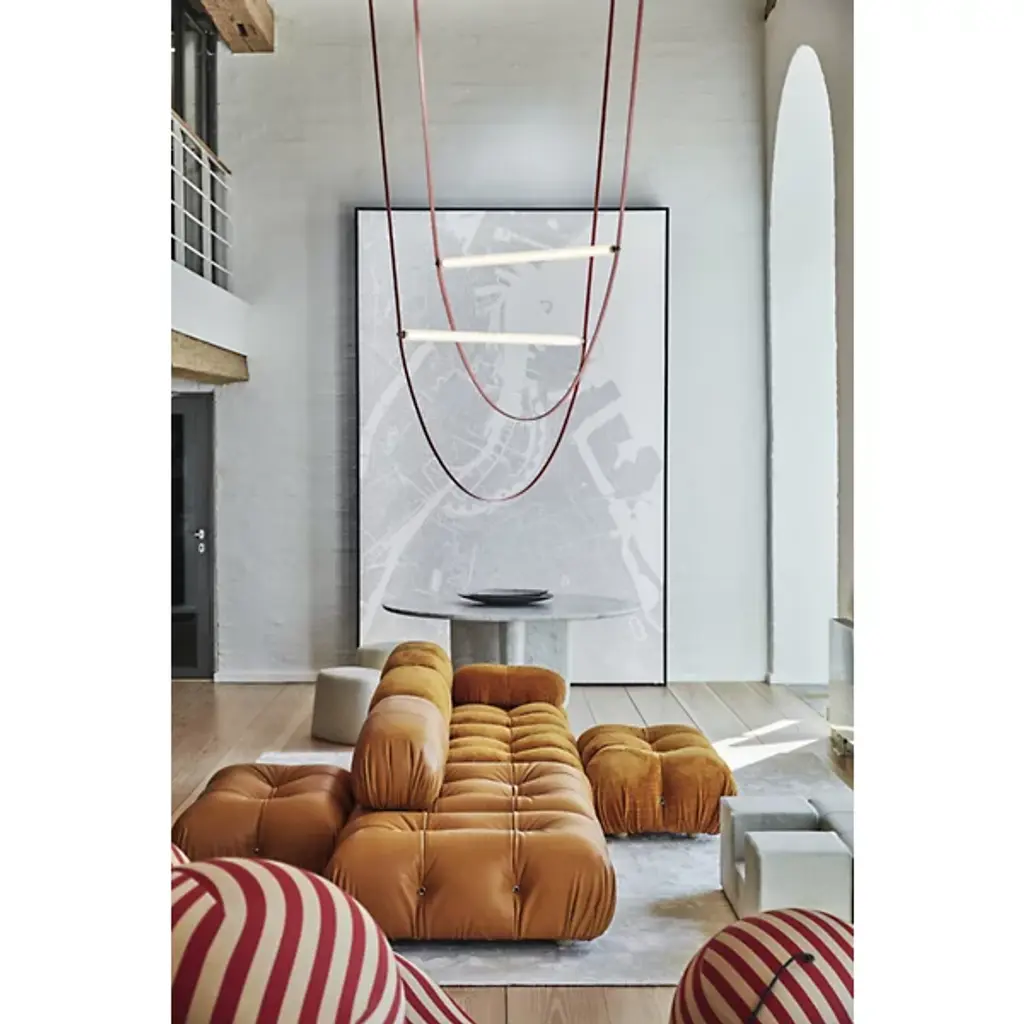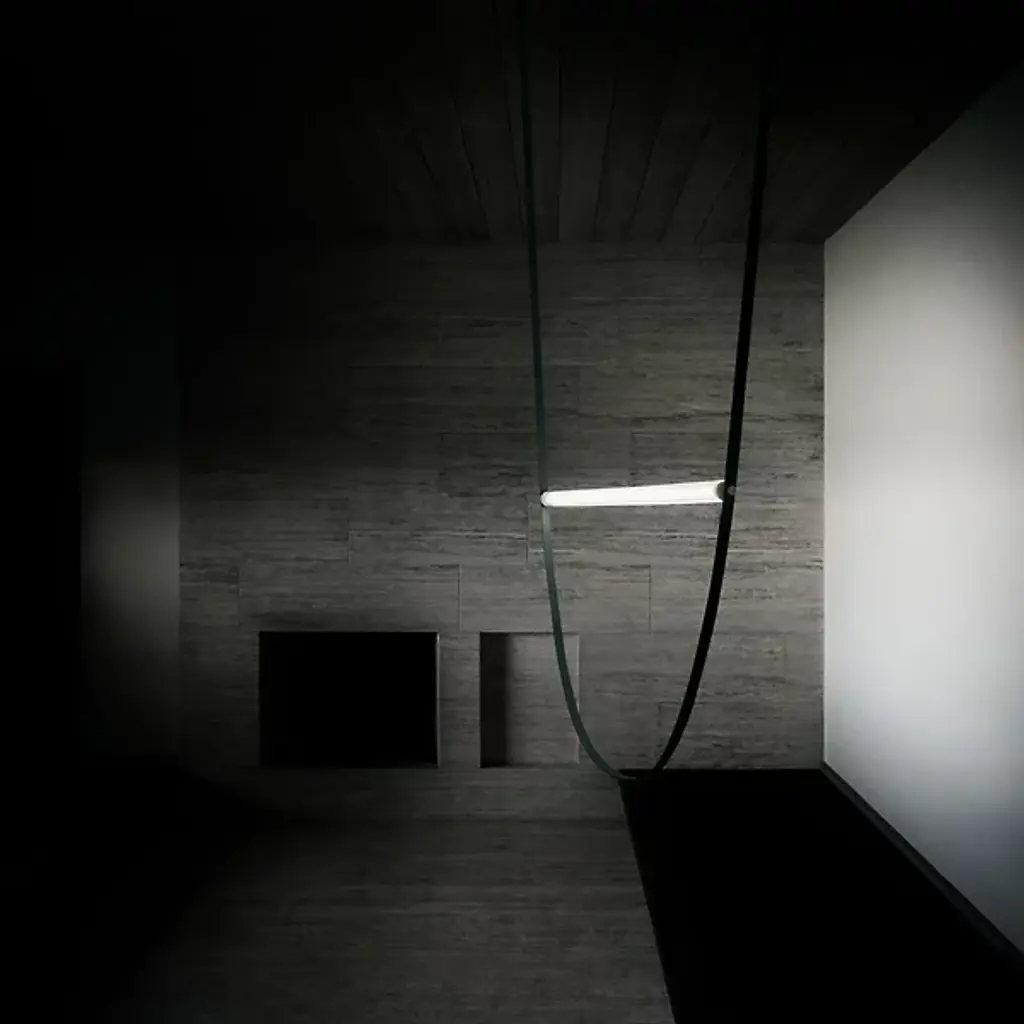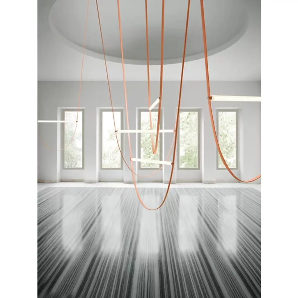 The Wireline LED Pendant Light by FLOS expresses an elegant blend of industrial simplicity and artistic refinement. An inspired design by Andrea Trimarchi and Simone Farresin, it uses a flexible rubber arc suspended from above as a fixture body and a means of suspending its lamping, which is comprised of a long LED integrated into a horizontally-ribbed extruded borosilicate glass cylinder. This fabulously functional design cuts direct glare, exchanging it for a warm, even ambiance in all directions while making a lasting impression.
