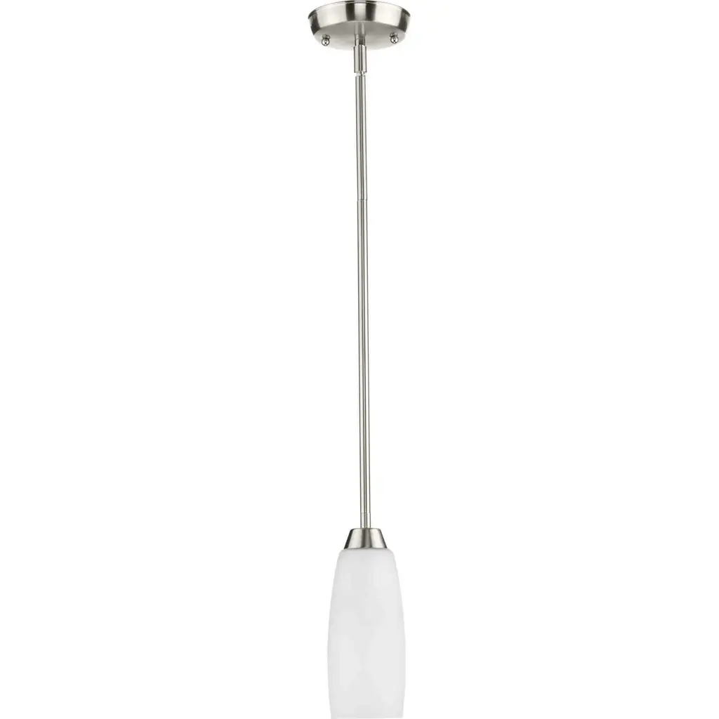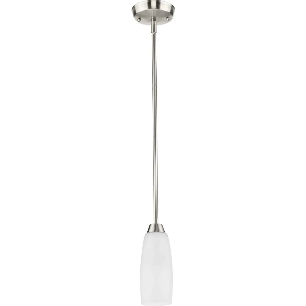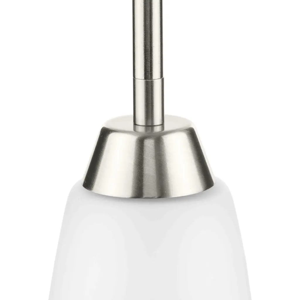 The Wisten Collection features sweeping arcs framing elegant, tapered glass shades. Cool and modern with a casual flair, Wisten provides a signature look to any room. Universal style for use with fans that accept an accessory light. One-light mini-pendant with elegant arm and etched glass. Incorporates a minimalist design style and represents a shift in trends to highlight a less complicated, clean design.
