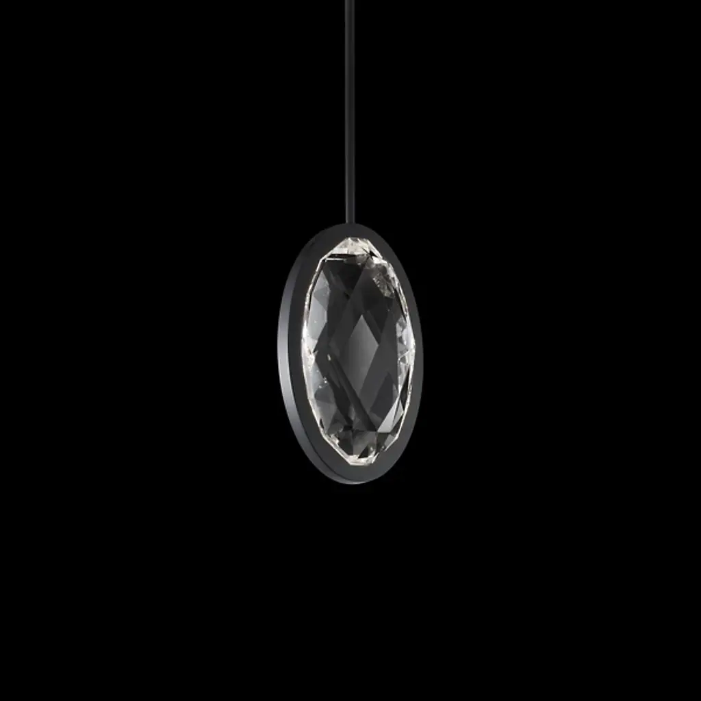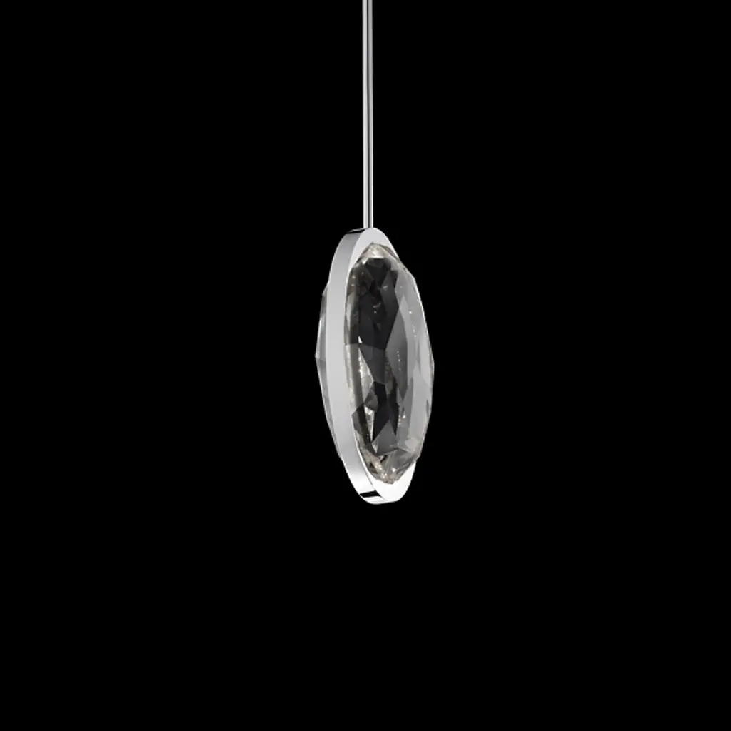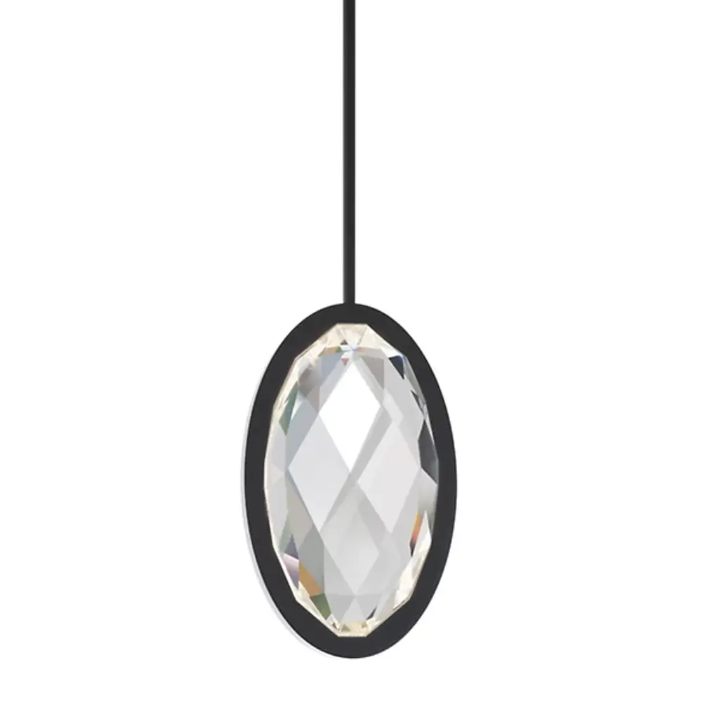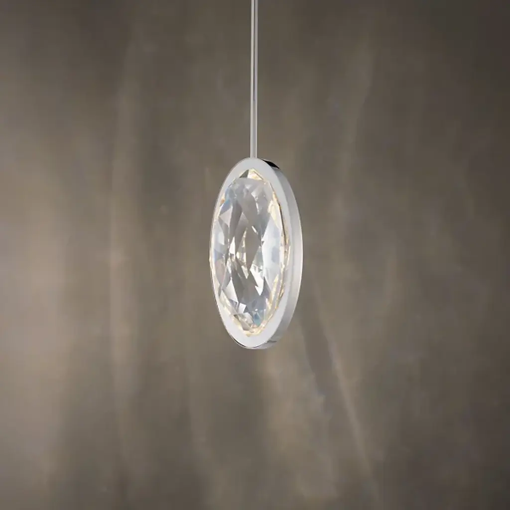 Simple, stylish, and wonderfully welcoming. The Wonder LED Mini Pendant from Schonbek Beyond starts simply, descending from above via a slender downrod that terminates in LED lamping set inside an oval ring. A faceted crystal diffuser is arranged within, its smooth surfaces transforming bright glare from the damp-listed lamping into a sparkling and engaging presence, working well in a small alcove, or standing out when evenly spaced as a set of multiple fixtures across a larger area.