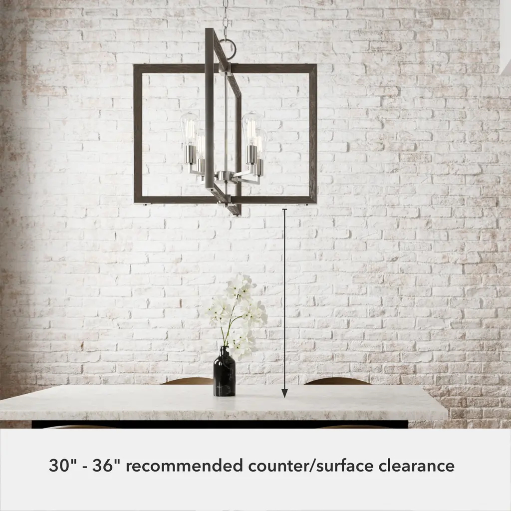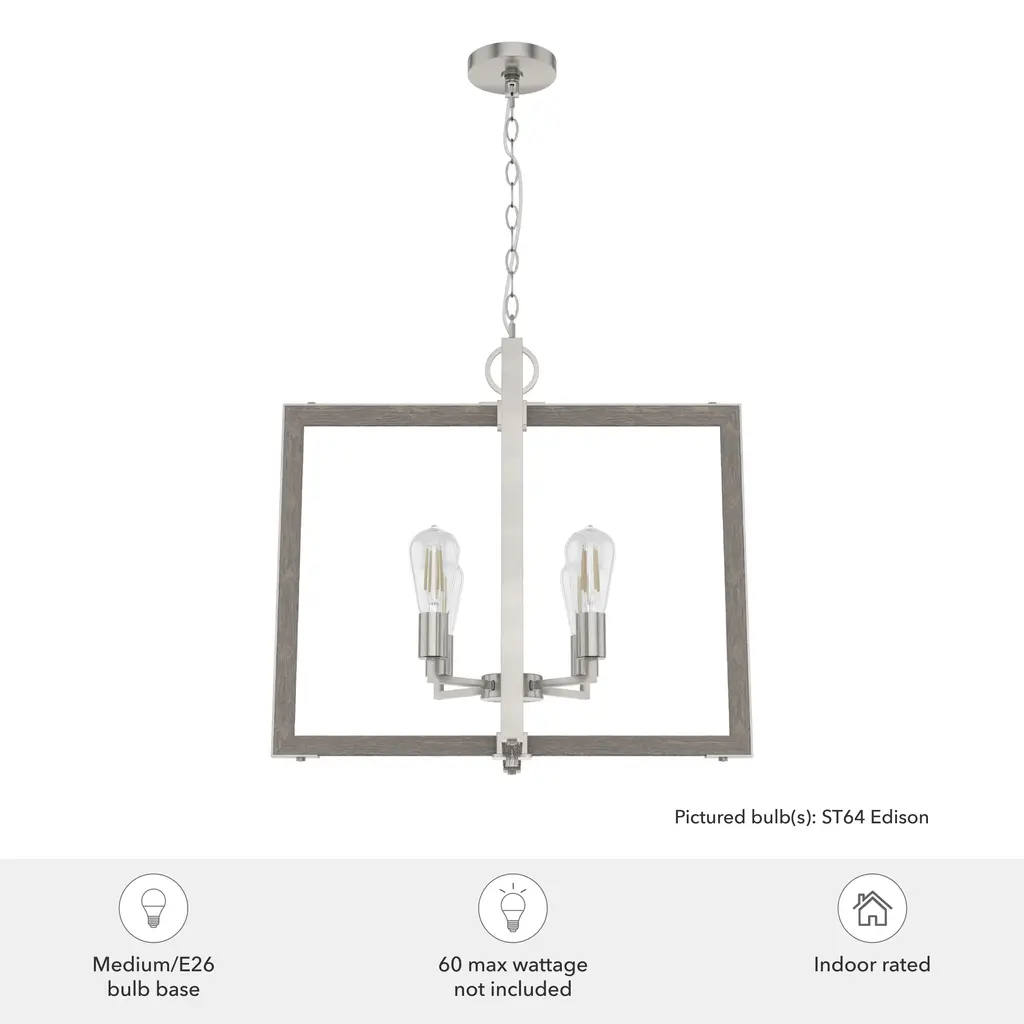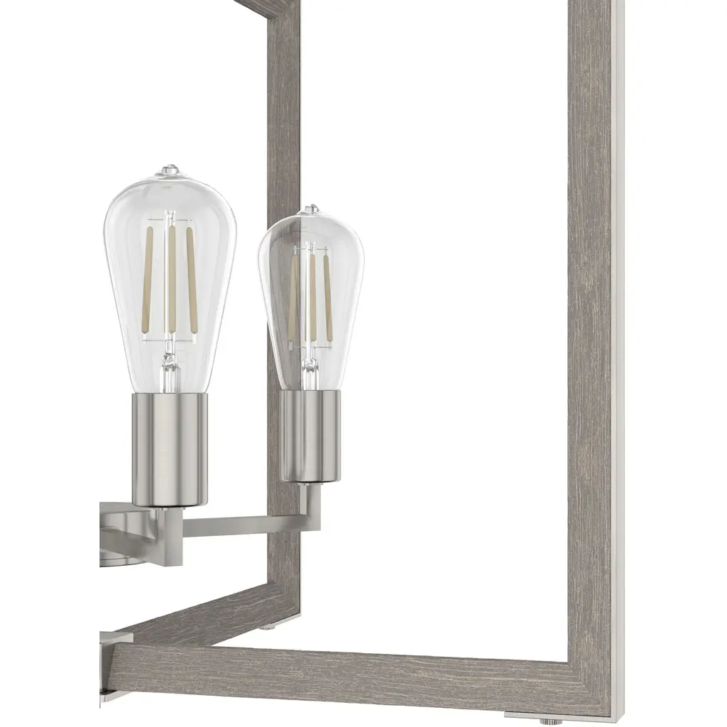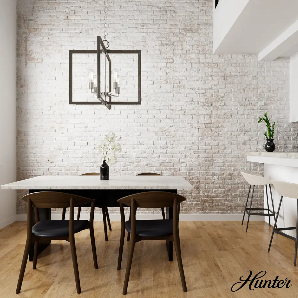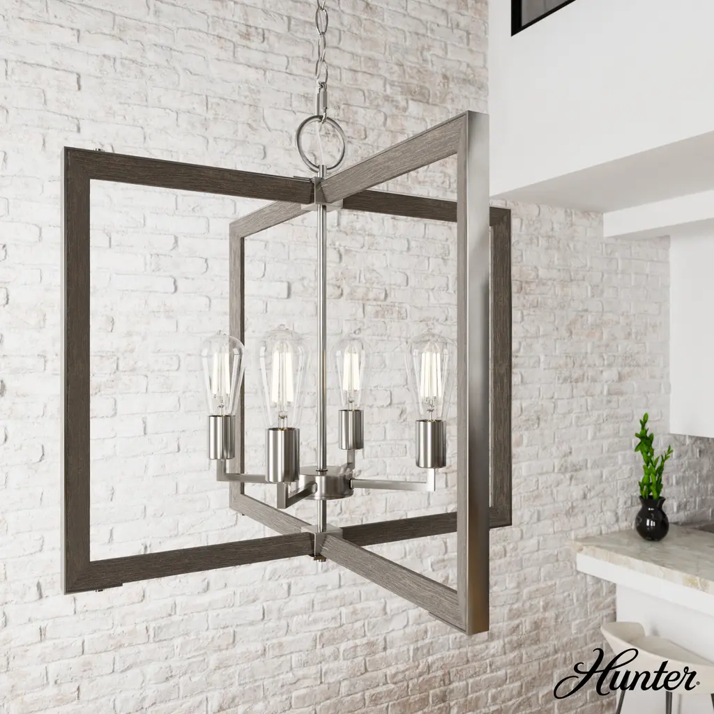 Fresh from Hunter’s Woodburn collection, this 4 light chandelier combines the crisp, clean angles of modern design with natural wood-inspired elements to evoke a rustic farmhouse feel. With an air of vintage charm, the Woodburn chandelier is casual enough to brighten your breakfast nook yet stylish enough to serve as a centerpiece. Infuse the rustic vibes of the Woodburn collection into your design scheme.