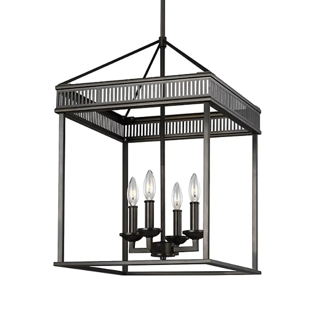 The Woodruff 4 Light Pendant by Visual Comfort Studio, formerly known as Sean Lavin, is a confident and modern interpretation of a classically styled lantern. With an open and airy rectangular Steel frame, a vented pattern around the top section of this piece adds some texture. Supported by angular arms, smooth candle stems hold an arrangement of candelabras within this fixture, creating a warm source of illumination to surroundings. Adding a welcoming and tailored touch to your home, this Pendant brings a new twist to a simply loved design.