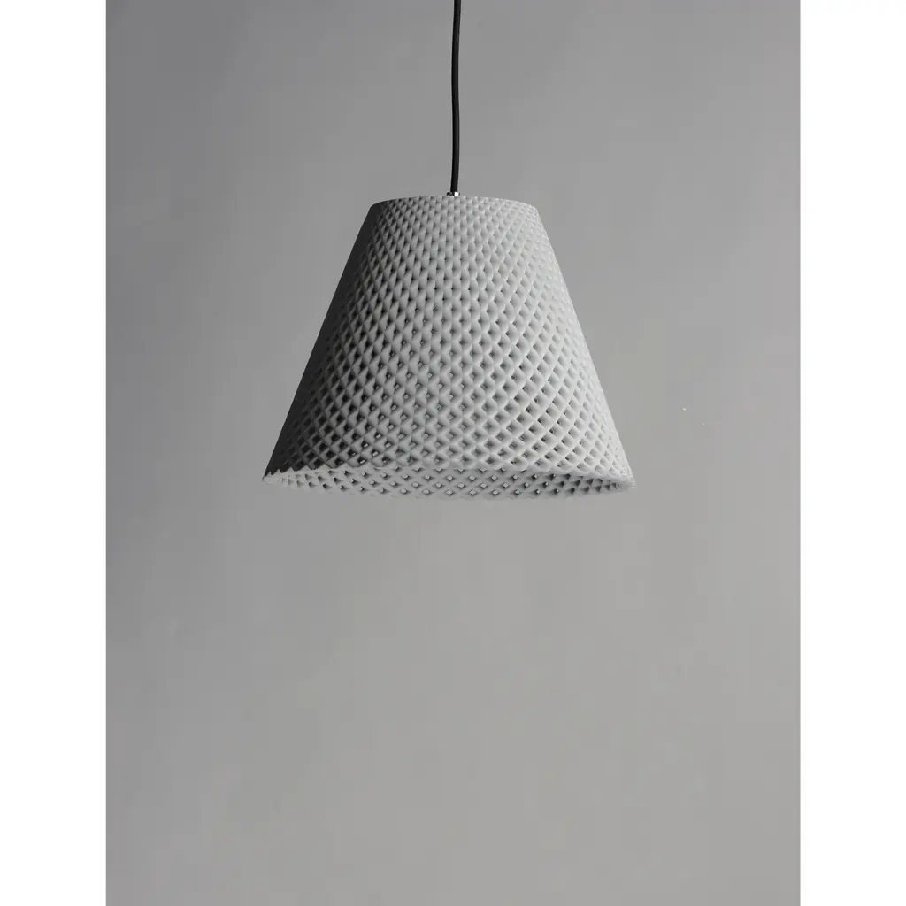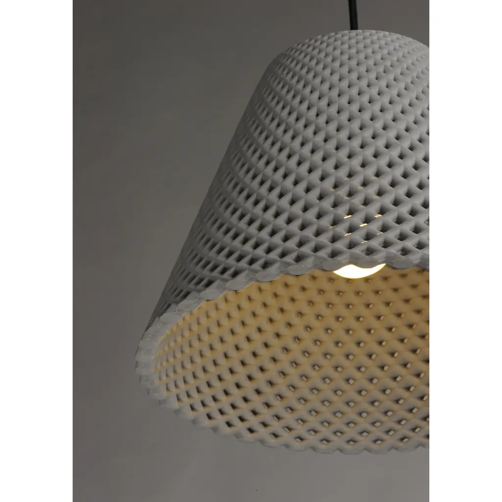Beautiful pendants cast in White Gypsum or Grey Concrete with a perforated woven pattern that allows light to penetrate through the sides as well as down. The material itself is paintable so you can customize for a perfect fit.