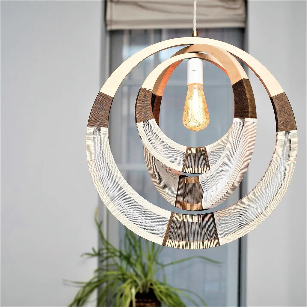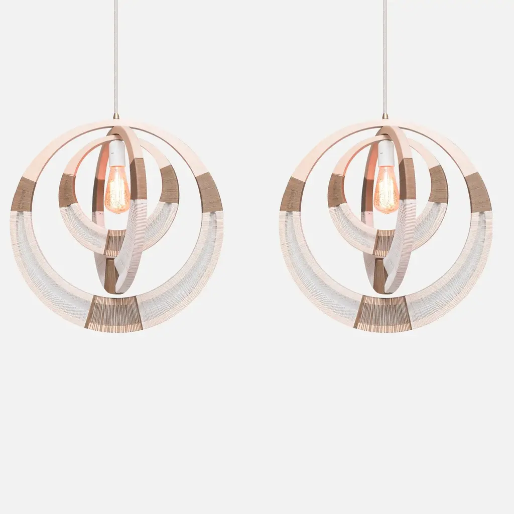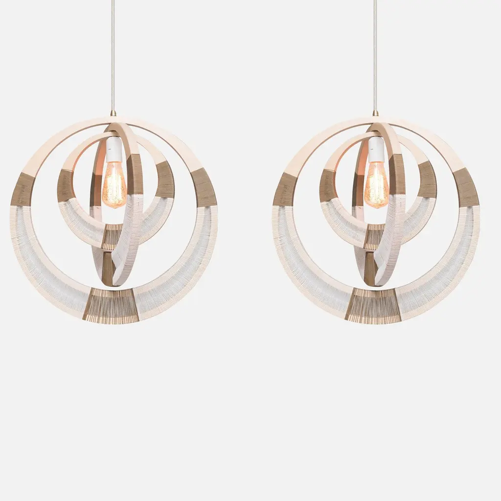 Introducing our exquisite Woven White Pendant Light, a true masterpiece in lighting design. This customer-favorite lighting for sale is inspired by intricate Ndebele African design jewelry. Ethically handcrafted by skilled artisans in Cape Town with wooden rings and white colored wax cord, this white hanging light can be installed to suspend from a range of ceiling heights. The attention to detail and care put into each white pendant light is apparent, making it a truly special addition to any space. , What sets this light fixture apart is its ability to hold a unique shape at multiple angles. The layers fit together seamlessly, creating a beautiful and intricate design that is sure to impress. And when it's time to ship, this white hanging lighting can be flat packed with ease, making it a convenient choice for those who value sustainable home lighting. Perfect for a modern kitchen or kitchen island, this white pendant light is sure to elevate any space with its unique woven design. The versatile ceiling light also fits seamlessly in dining rooms as a white dining room light fixture. As a 54kibo exclusive, you won't find this stunning white and brown light fixture anywhere else. If you're looking to buy lighting, this pendant light is perfect for you. As seen in Architectural Digest.