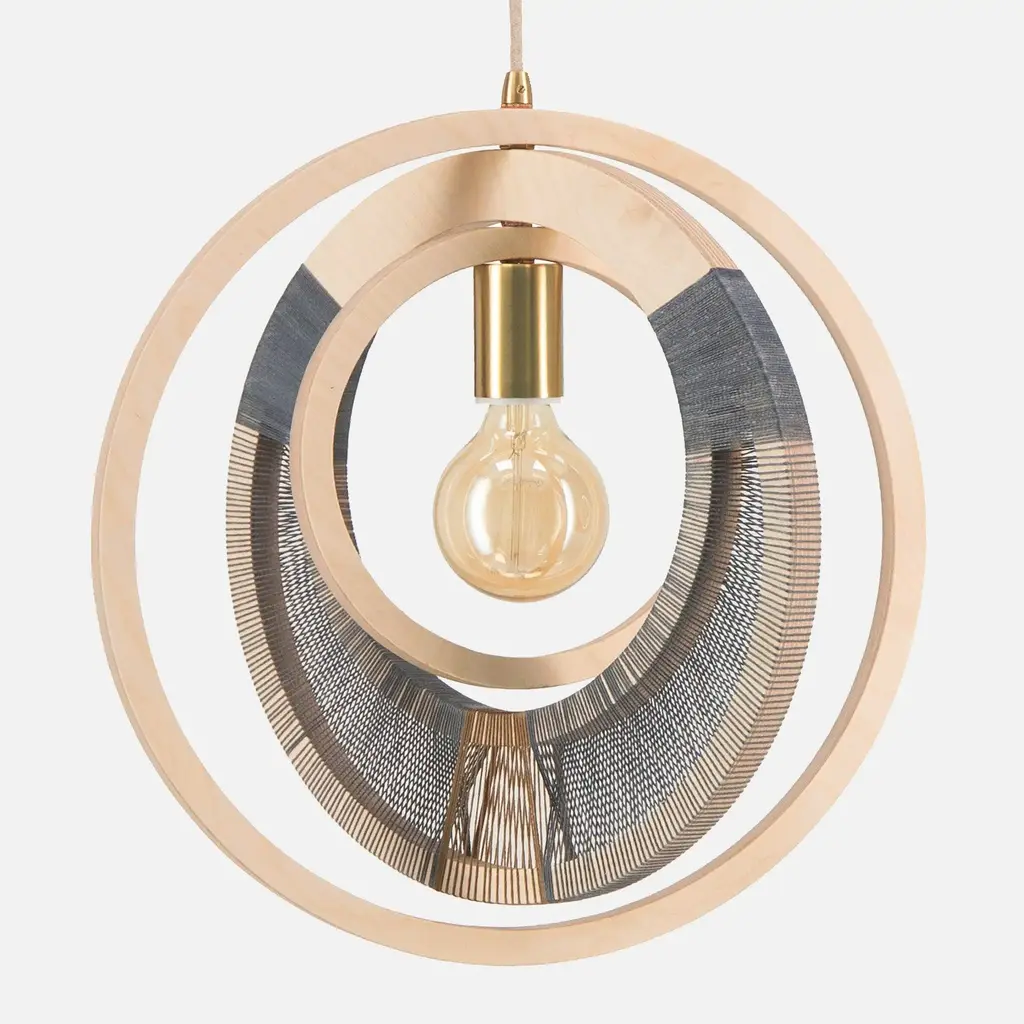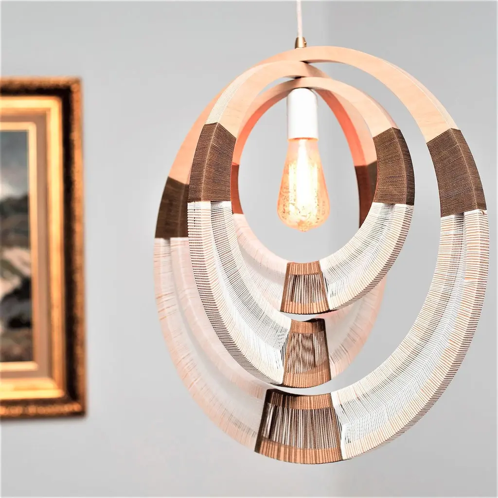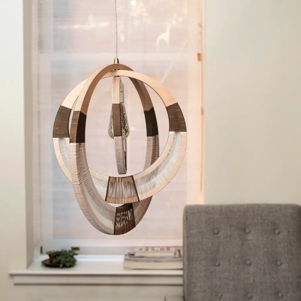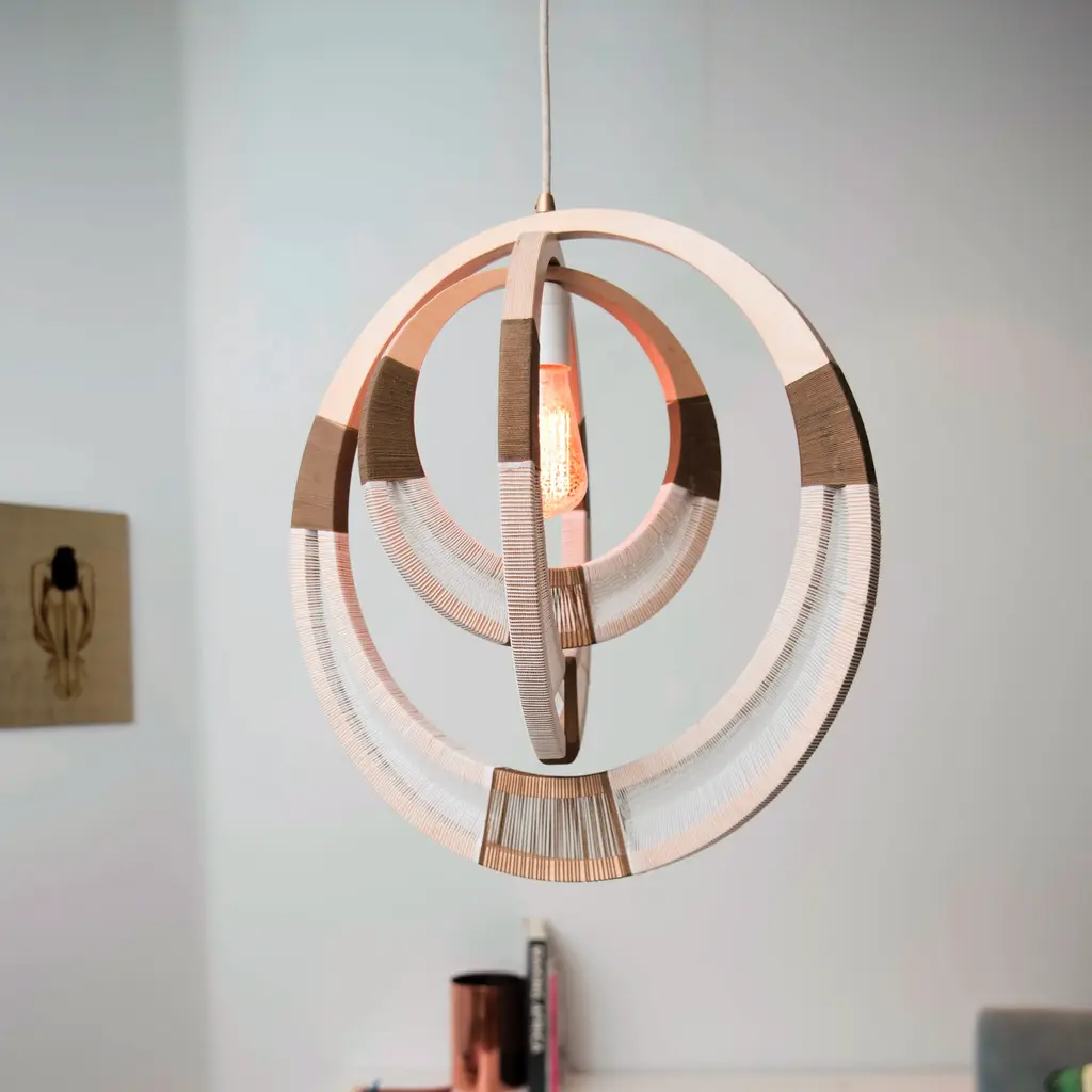 Introducing our exquisite Woven White Pendant Light, a true masterpiece in lighting design. This customer-favorite lighting for sale is inspired by intricate Ndebele African design jewelry. Ethically handcrafted by skilled artisans in Cape Town with wooden rings and white colored wax cord, this white hanging light can be installed to suspend from a range of ceiling heights. The attention to detail and care put into each white pendant light is apparent, making it a truly special addition to any space. , What sets this light fixture apart is its ability to hold a unique shape at multiple angles. The layers fit together seamlessly, creating a beautiful and intricate design that is sure to impress. And when it's time to ship, this white hanging lighting can be flat packed with ease, making it a convenient choice for those who value sustainable home lighting. Perfect for a modern kitchen or kitchen island, this white pendant light is sure to elevate any space with its unique woven design. The versatile ceiling light also fits seamlessly in dining rooms as a white dining room light fixture. As a 54kibo exclusive, you won't find this stunning white and brown light fixture anywhere else. If you're looking to buy lighting, this pendant light is perfect for you. As seen in Architectural Digest.