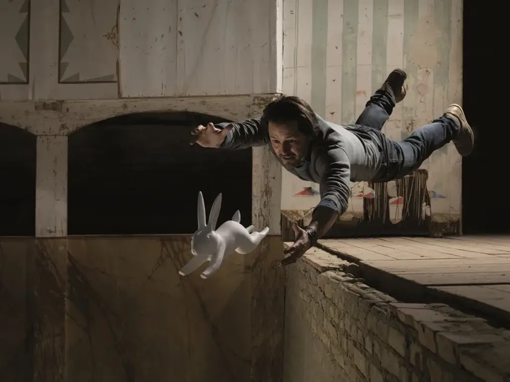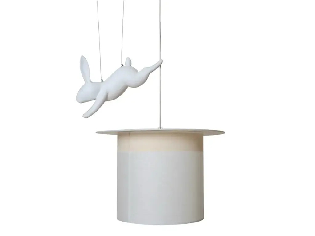 WOW is a magician’s top hat where white rabbits are supposed to come out from and at the same time is an expression of amazement we are all used to say to express wonder! It’s the unexpected, unusual able to add liveliness to our everyday life. WOW is an ironical lamp with a very plain structure: white linen amplifies emotions and the rabbit ready to spring out of the top hat leads us to a magic and striking tale. A contemporary fairy tale, which can be told both in a modern loft as well as in a country house.Technical Informationwhite linen shademax 1x100W - E27 energy savingOPTIONAL White matt ceramic suspended little rabbit “SILVAN”cm 46 x 26