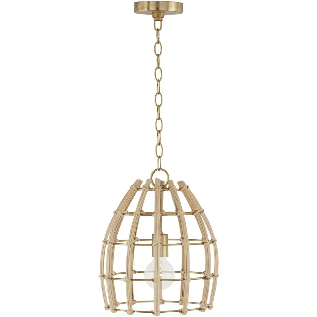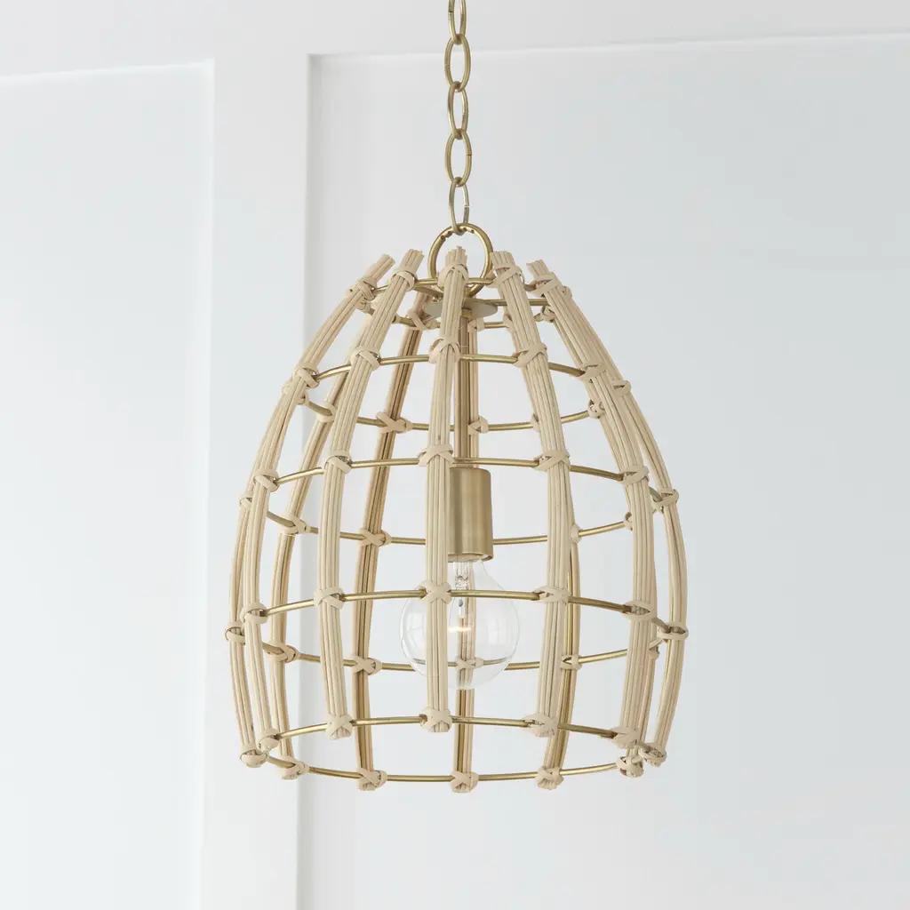 The hand-bent rattan and basket silhouette of the Wren Small Pendant creates sculptural intrigue. The Matte Brass finish brings out the natural warmth of the artisan crafted material for a style that is organically beautiful.