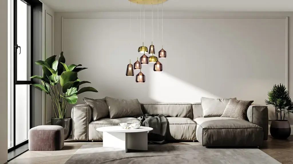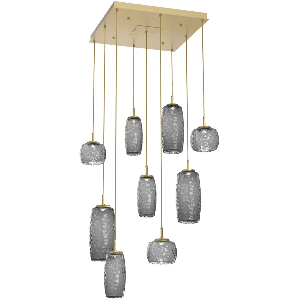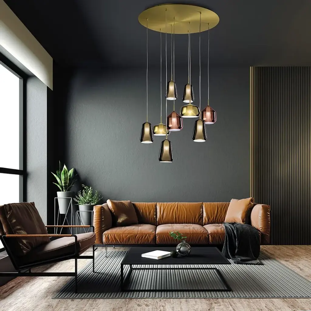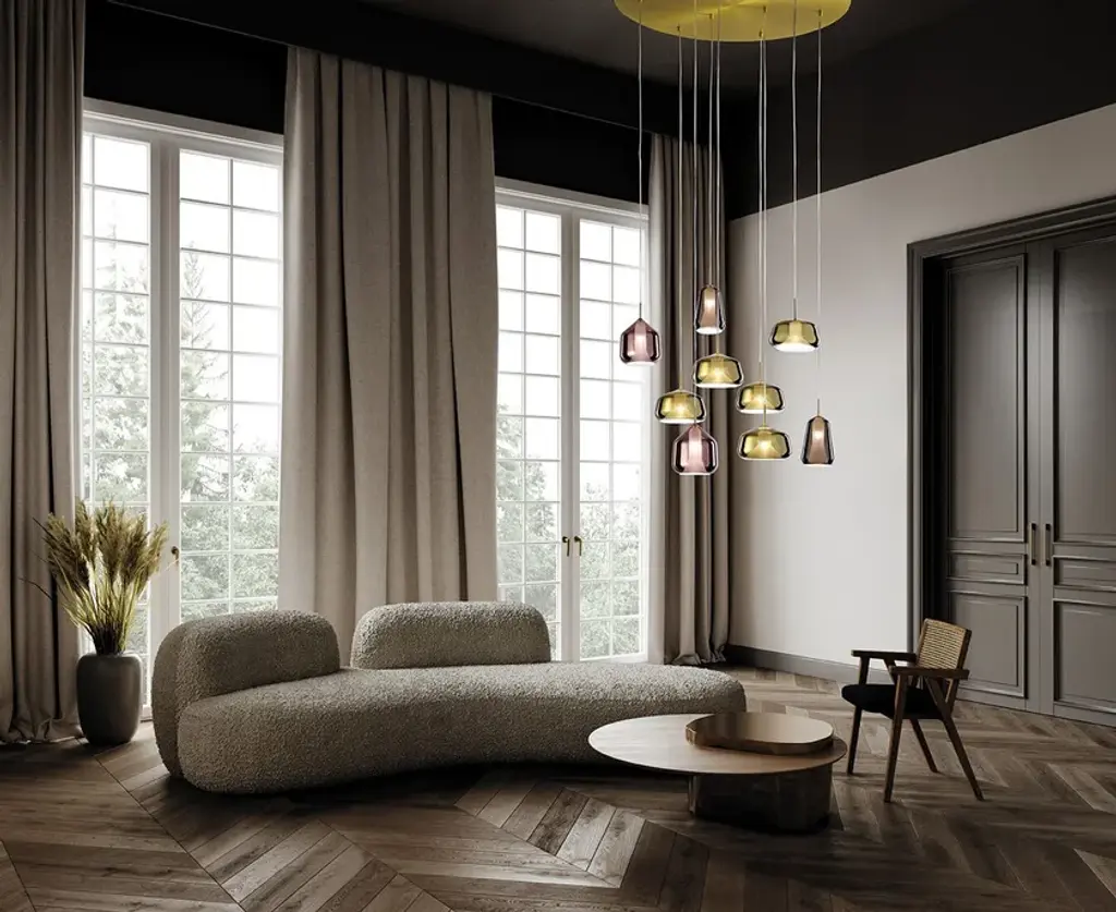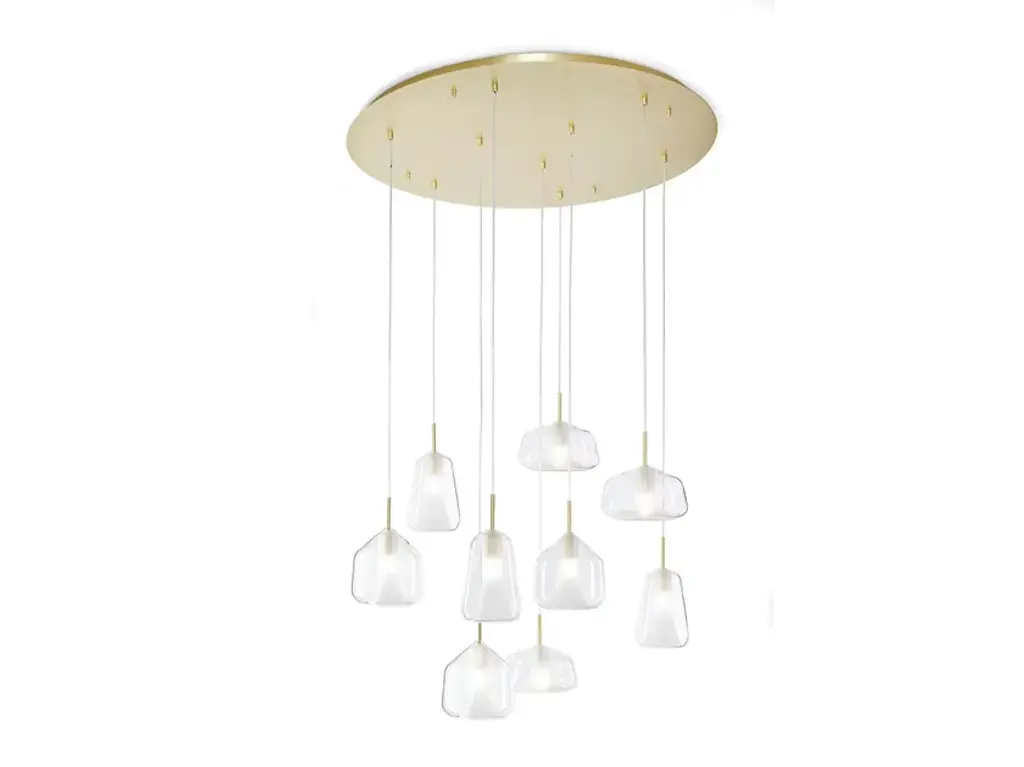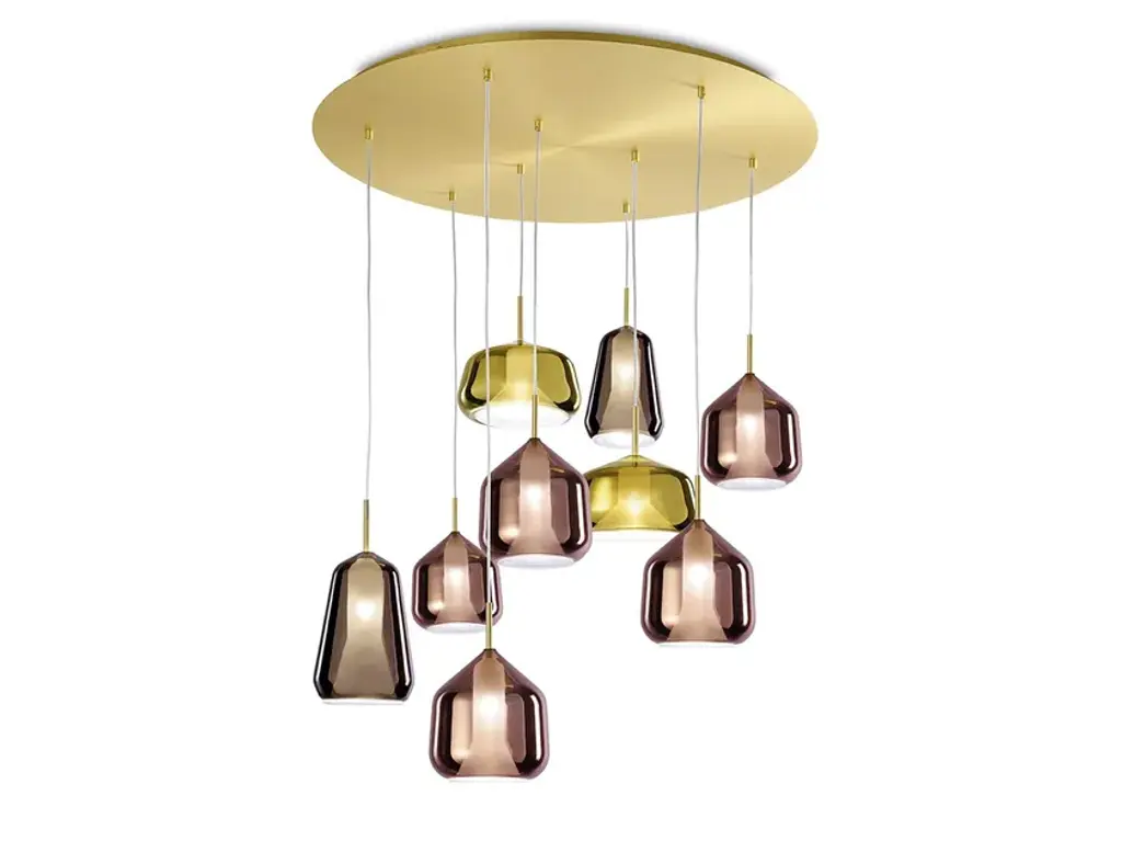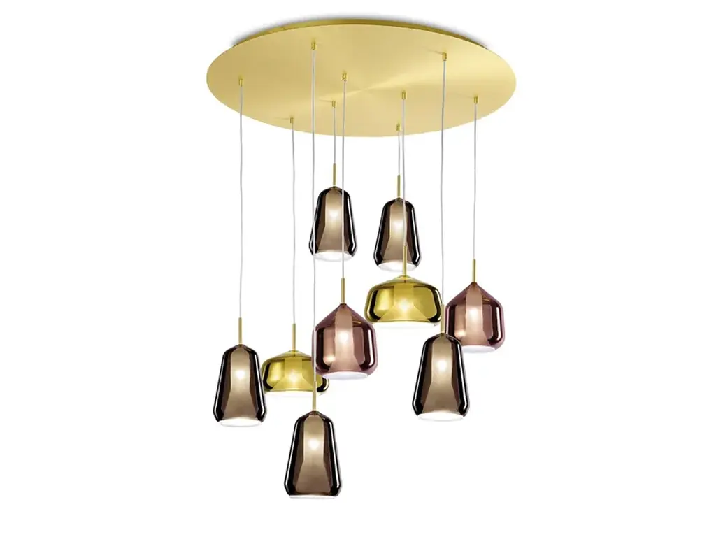 X-Ray 9 is a suspension lamp with 9 lights in pyrex glass. Available in:Transparent (ART.1744.137.KIT)Multicolor - 2 bronze, 2 copper, 5 gold (ART.KIT.M.15)Multicolor - 5 bronze, 2 copper, 2 gold (ART.KIT.M.16)Multicolor - 2 bronze, 5 copper, 5 gold (ART.KIT.M.17)Canopy and details in brushed gold. G9 bulbs. Chance to use LED bulbs.Technical information:- Light source: G9- Power: 9 x max 40w