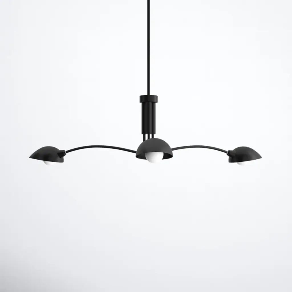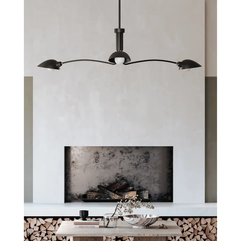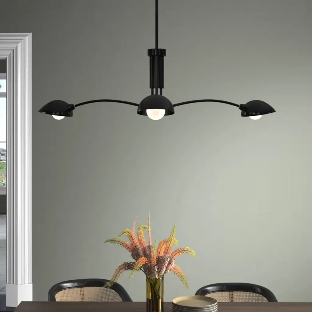 Minimalism with presence, the product has a clean, sculptured look that fills a space. Rounded shades suspend from sprawling metal arms, all in a soft black finish. The three-bulb pendant is over six-and-a-half feet in diameter. The shades rotate to create a customized lighting plan. This expansive fixture will bring stunning style to any large space.